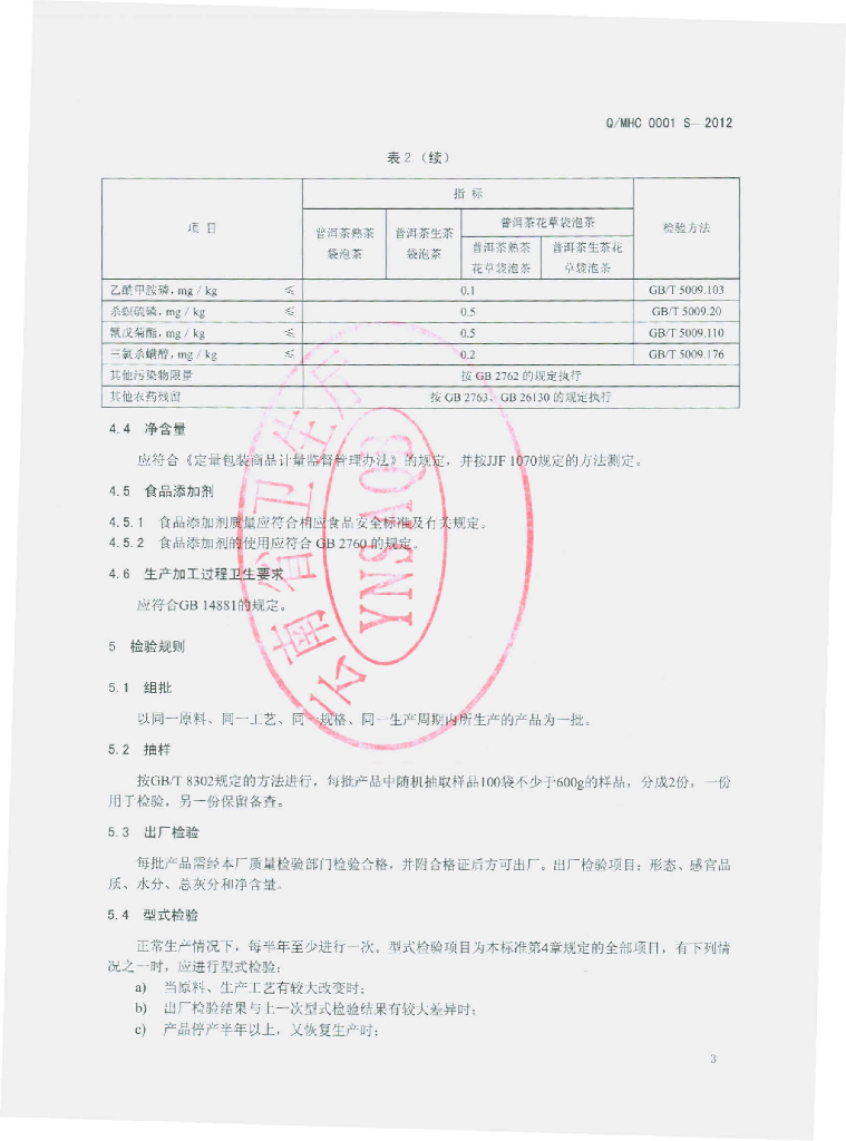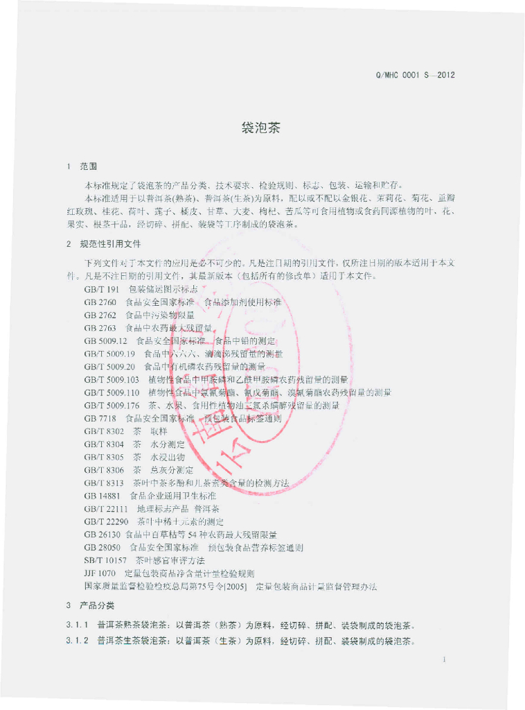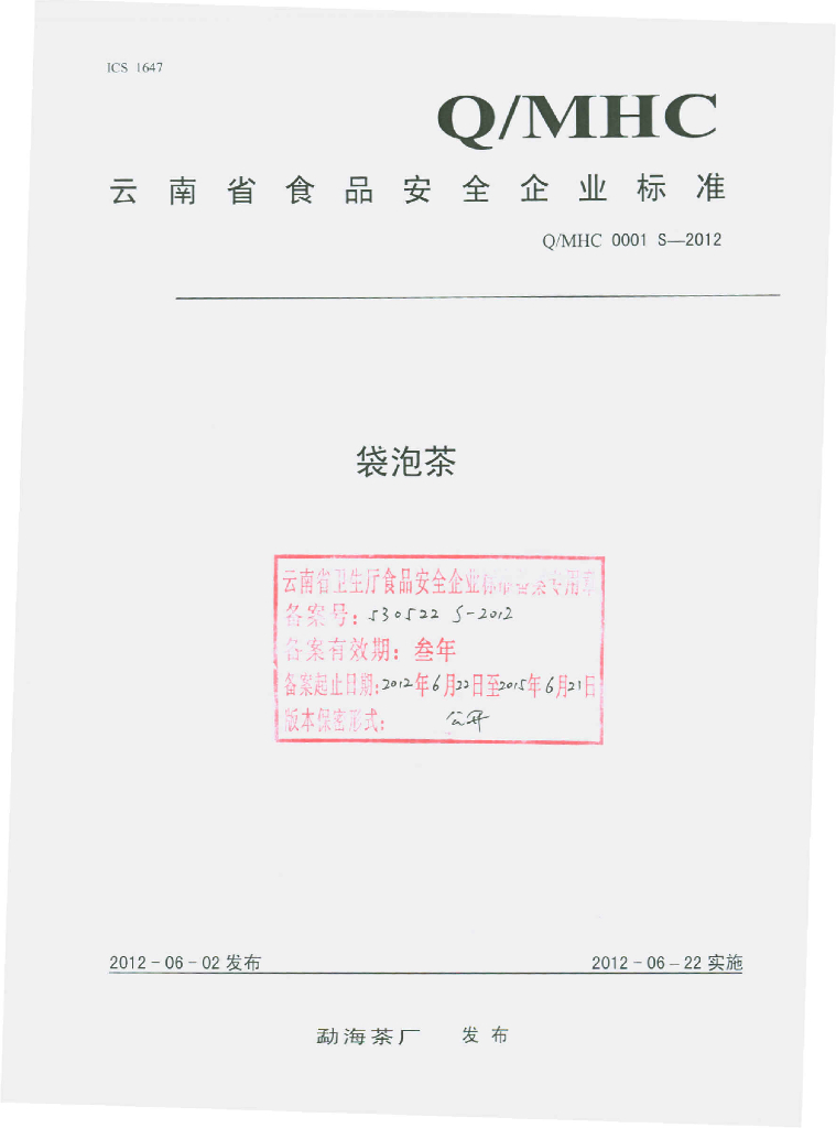 Q/MHC 0001S-2012 袋泡茶