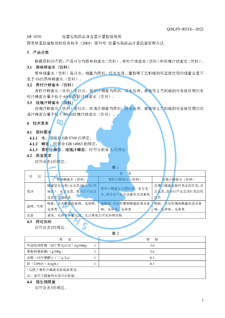 Q/SLFN 0021S-2022 蜂蜜水(饮料)