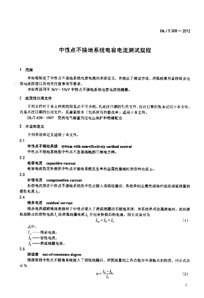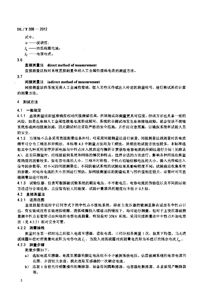 DL/T 308-2012 中性点不接地系统电容电流测试规程