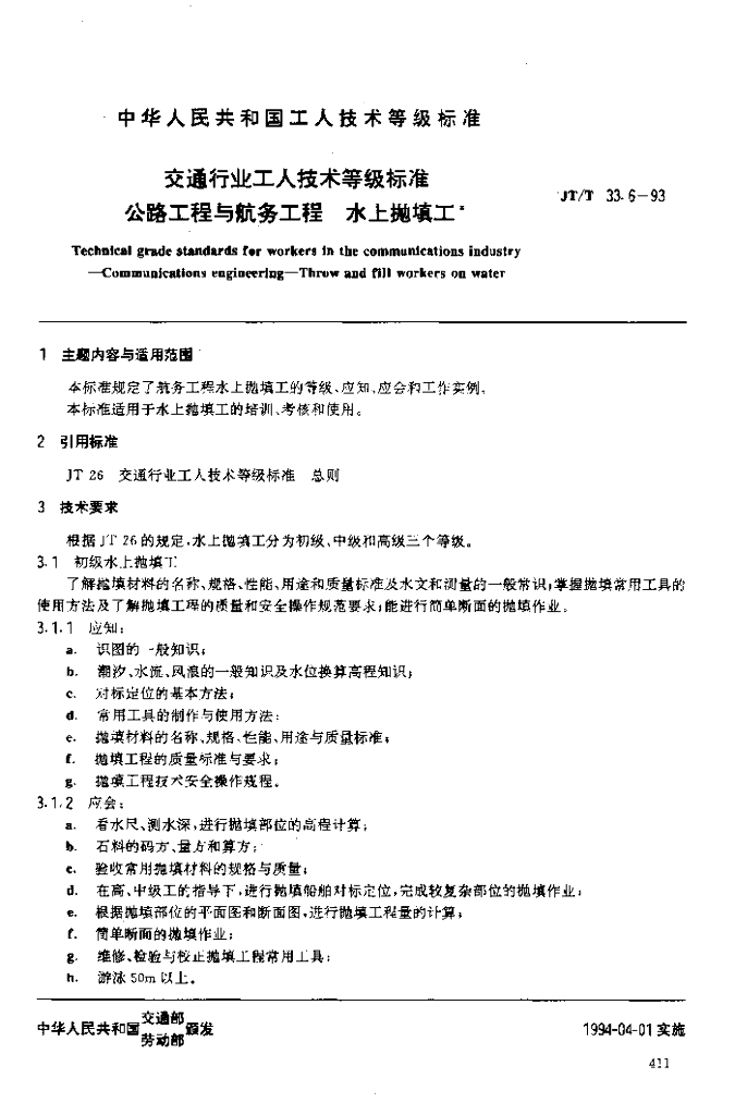 JT/T 33.6-1993 交通行业工人技术等级标准公路工程与航务工程水上抛填工