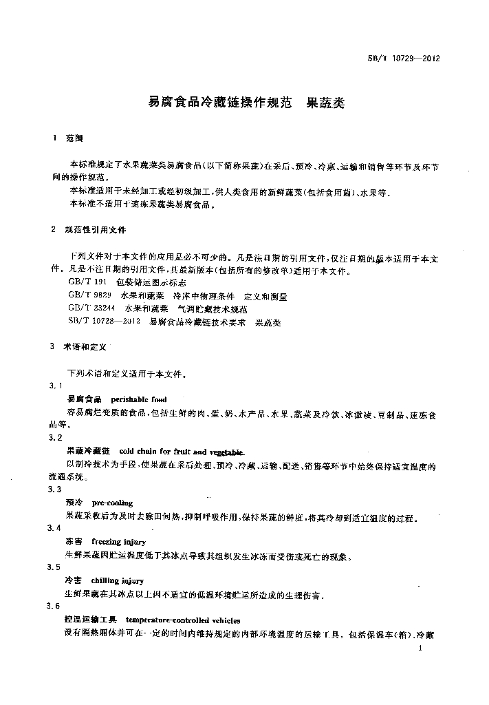 SB/T 10729-2012 易腐食品冷藏链操作规范 果蔬类