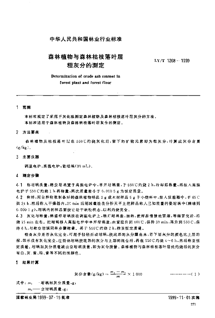 LY/T 1268-1999 森林植物与森林枯枝落叶层粗灰分的测定
