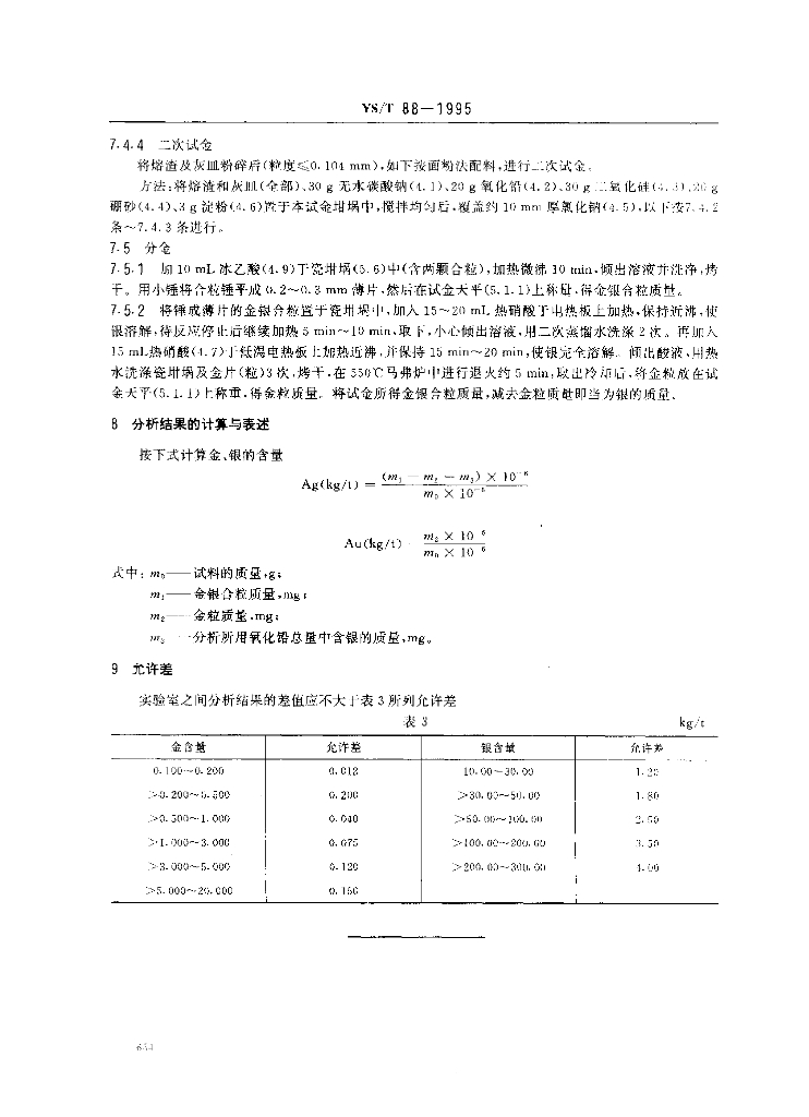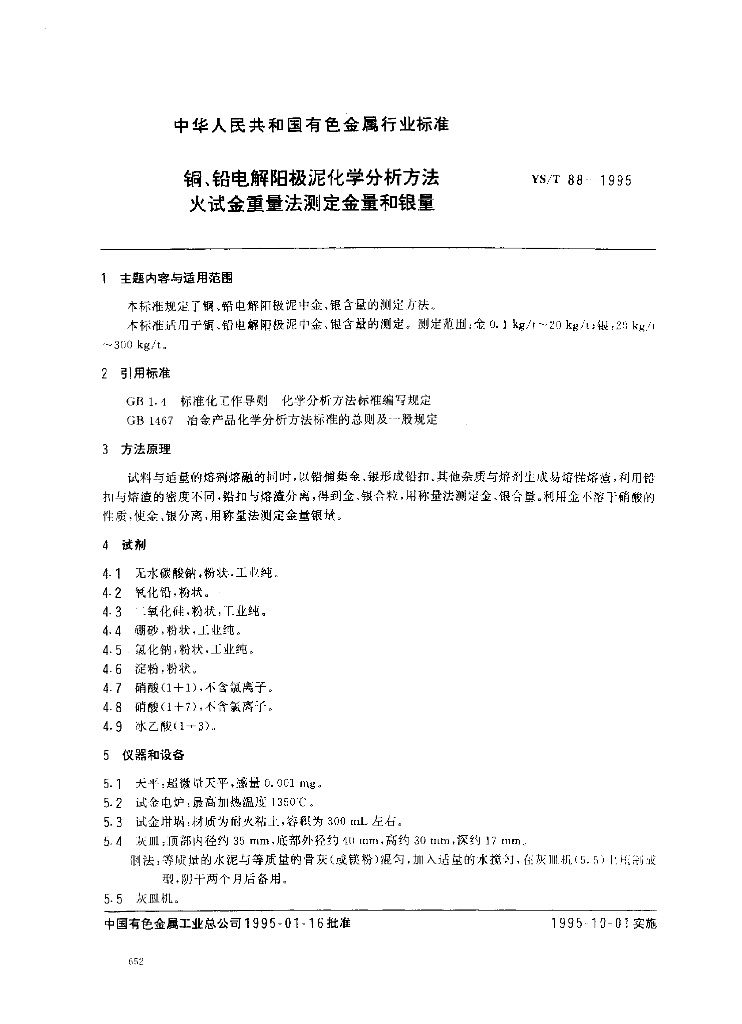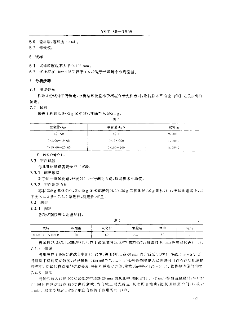 YS/T 88-1995 铜、铅电解阳极泥化学分析方法火试金重量法测定金量和银量