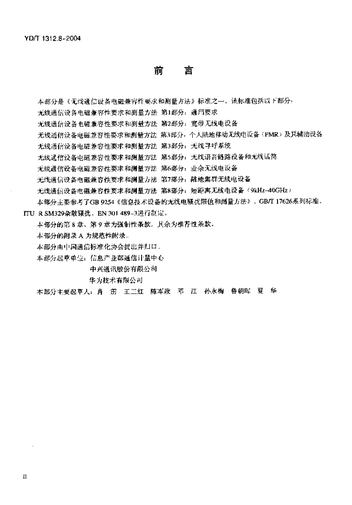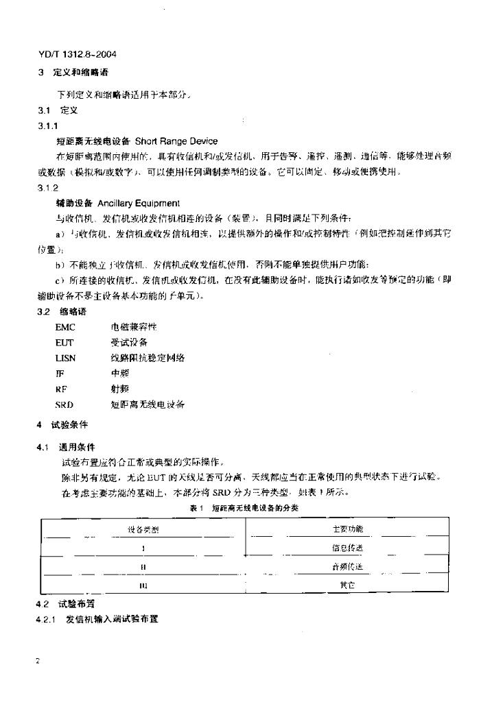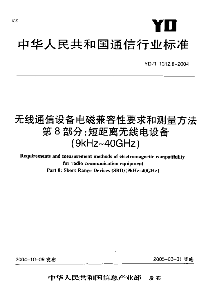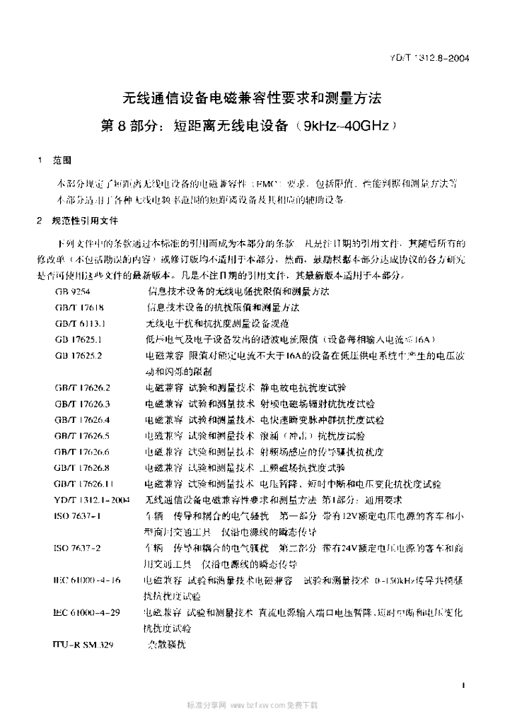 YD/T 1312.8-2004 无线通信设备电磁兼容性要求和测量方法 第8部分:短距离无线电设备(9kHz~40GHz)