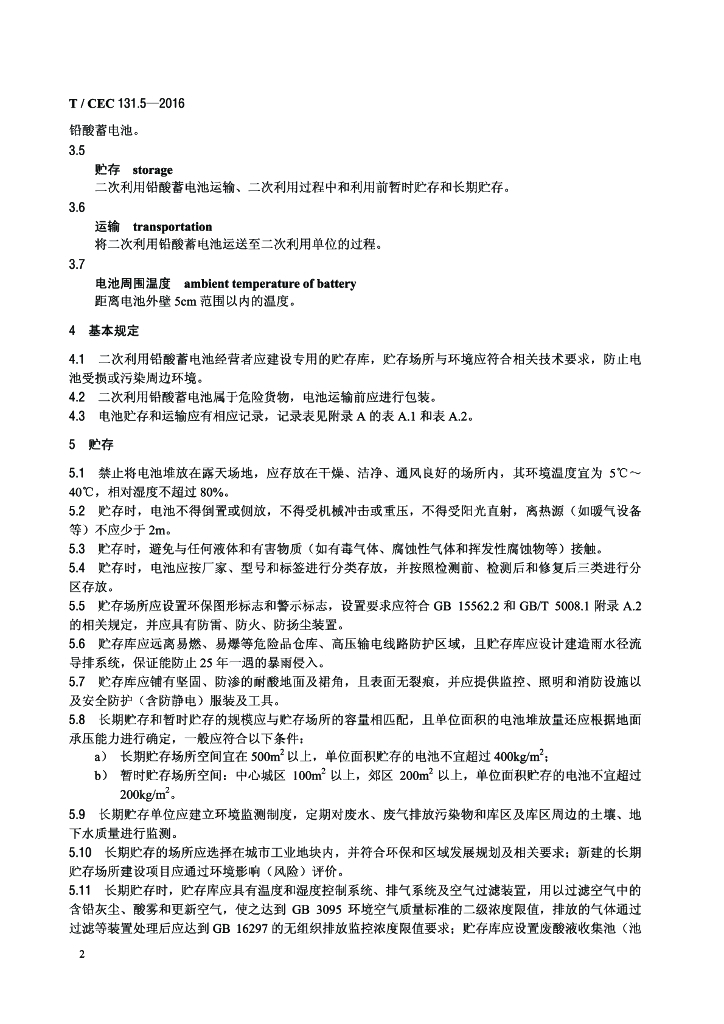 T/CEC 131.5-2016 铅酸蓄电池二次利用 第5部分:电池贮存与运输技术规范