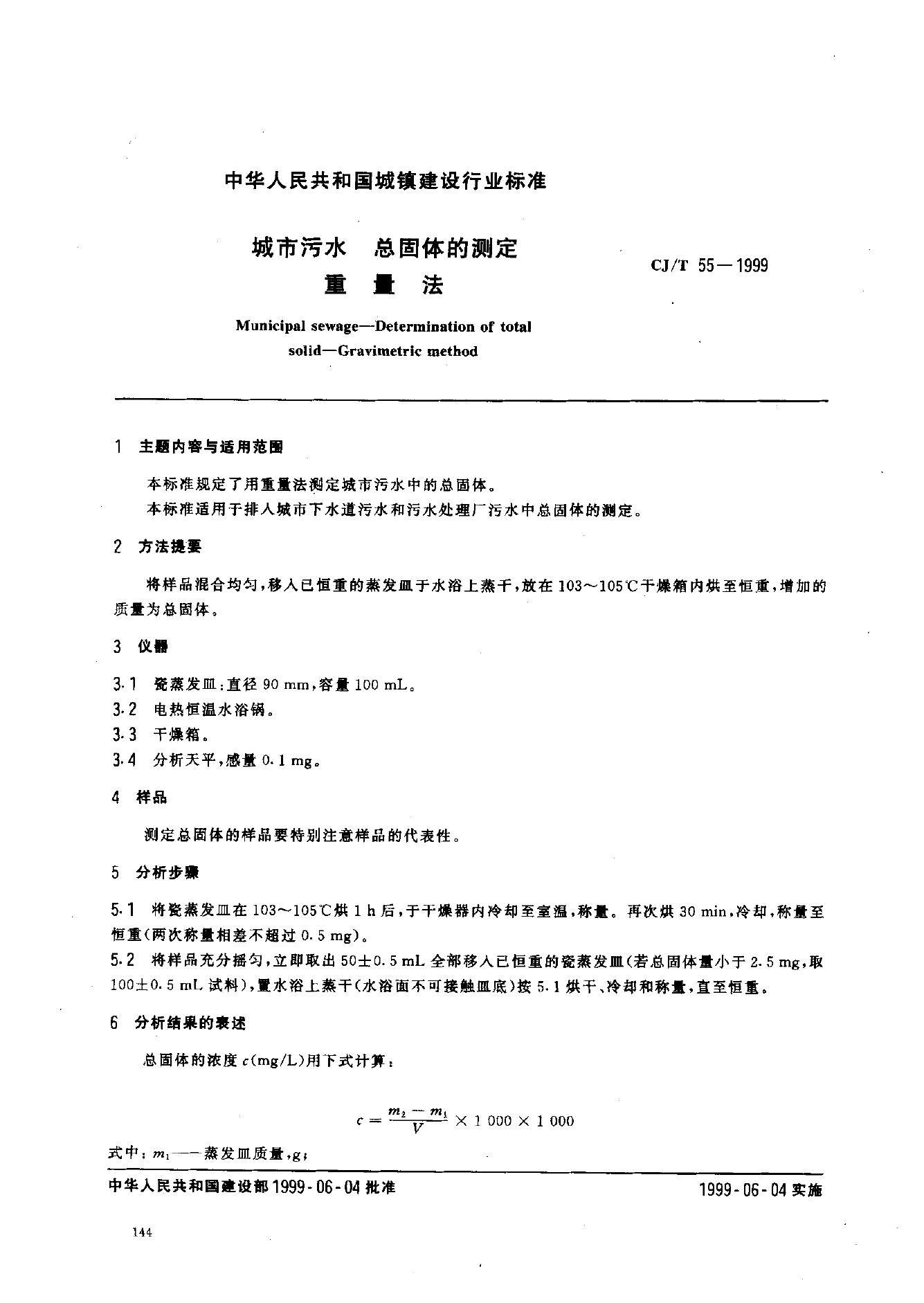 CJ 26.5-1991 城市污水水质检验方法标准 总固体的测定 重量法