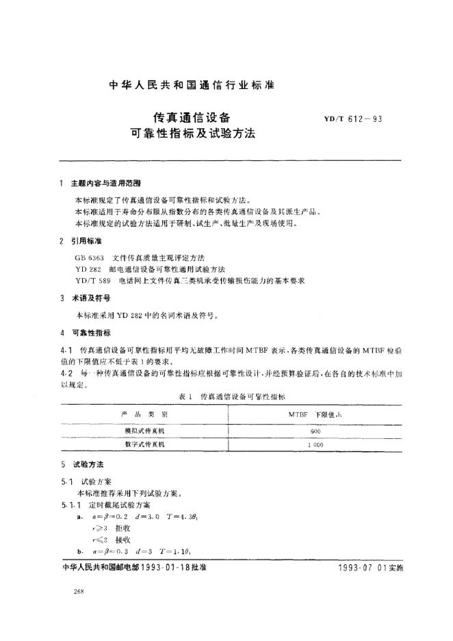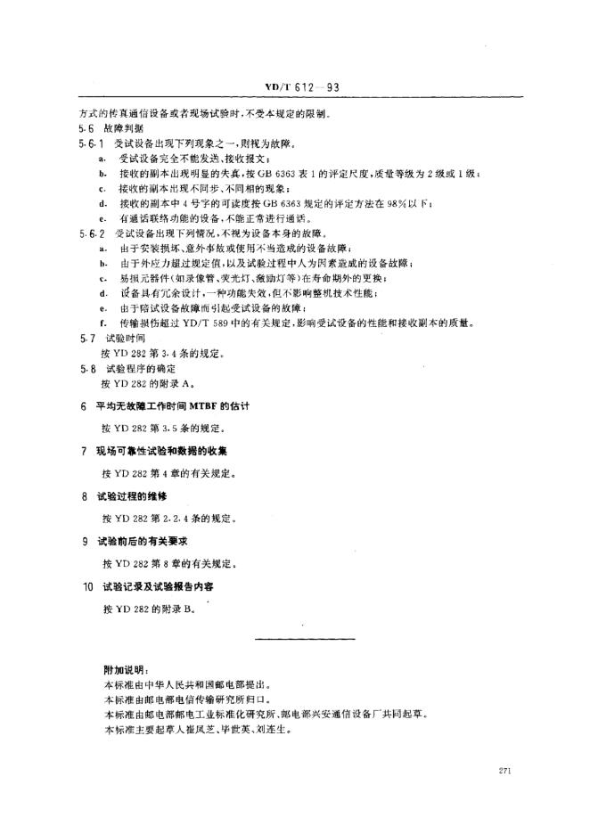YD/T 612-1993 传真通信设备可靠性指标及试验方法