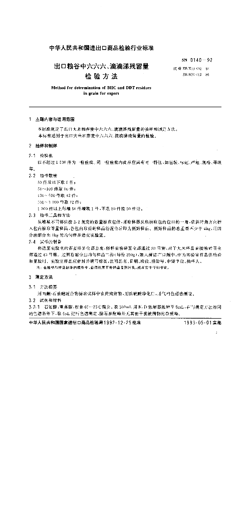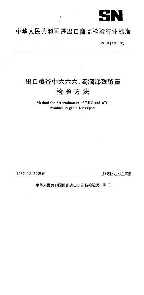 SN 0140-1992 出口粮谷中六六六、滴滴涕残留量检验方法