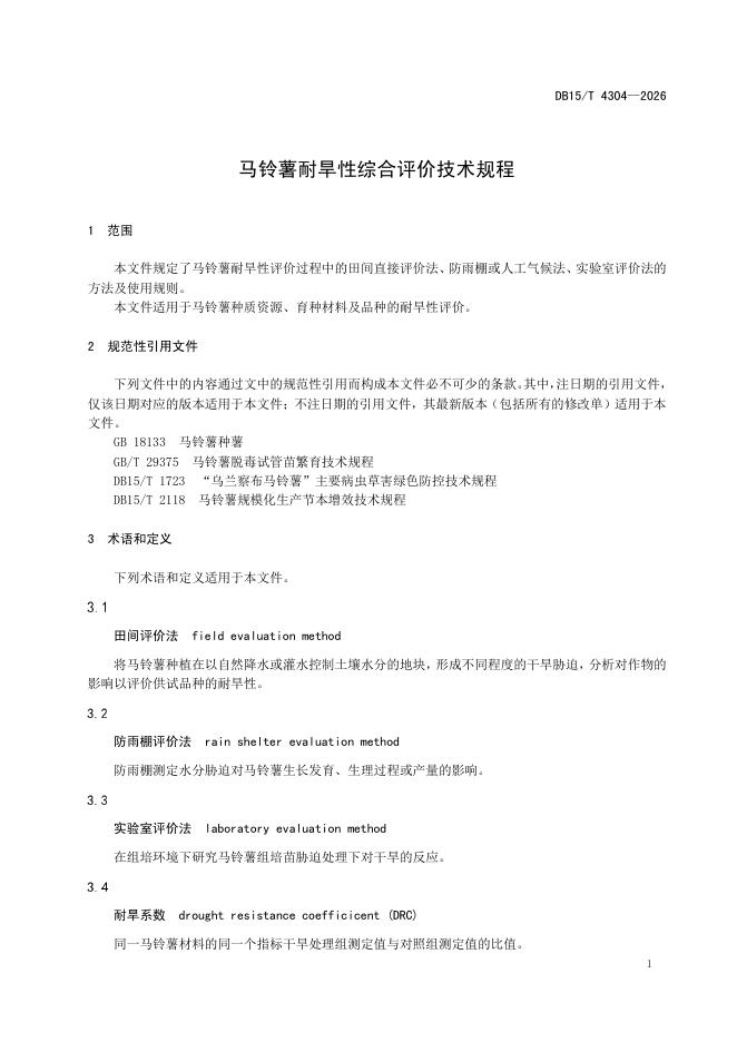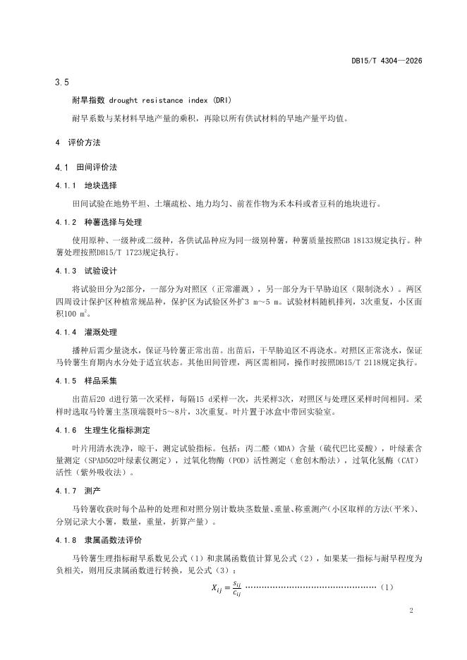 DB15/T 4304-2026 马铃薯耐旱性综合评价技术规程