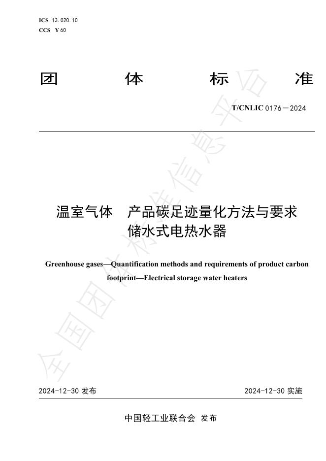 T/CNLIC 0176-2024 温室气体 产品碳足迹量化方法与要求 储水式电热水器