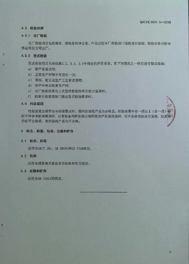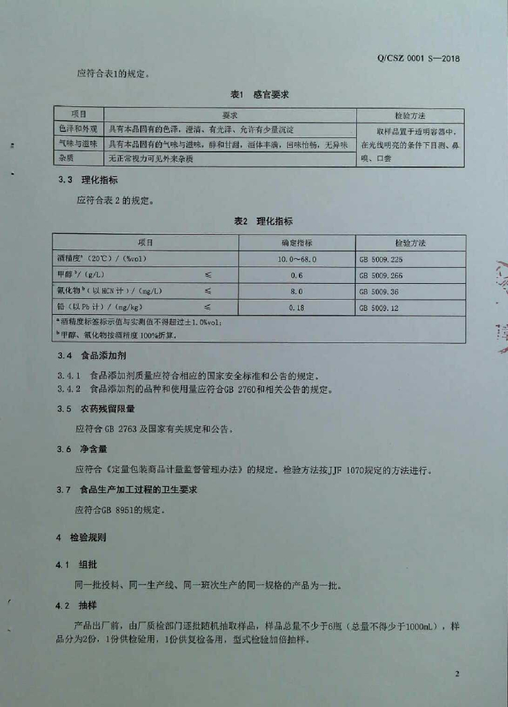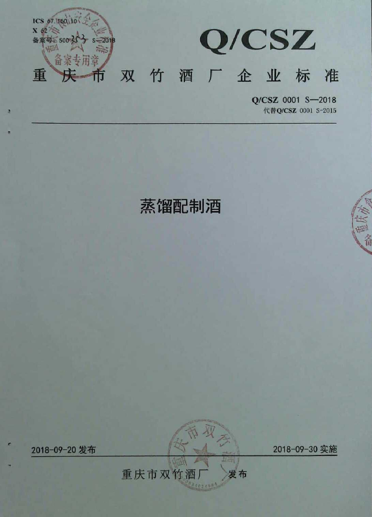 Q/CSZ 0001S-2018 蒸馏配制酒