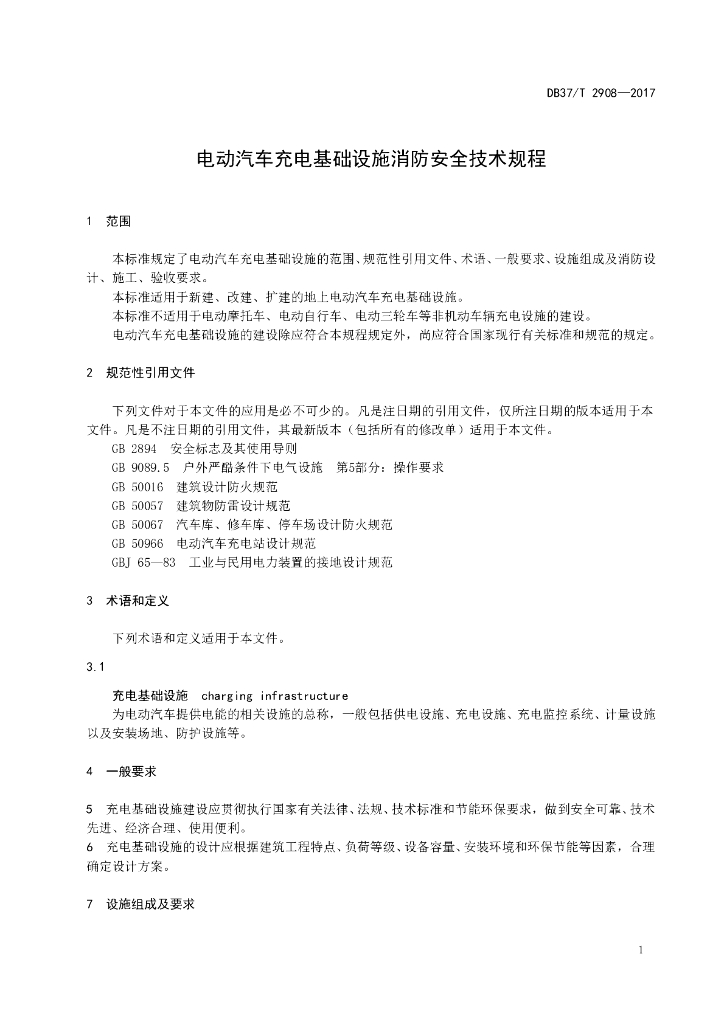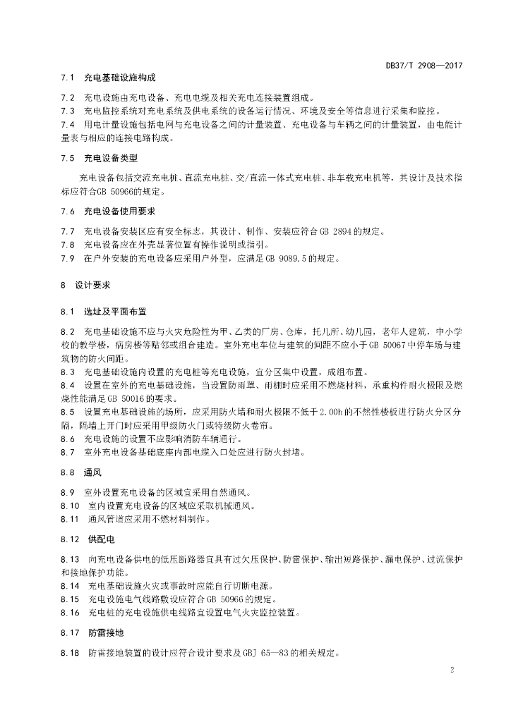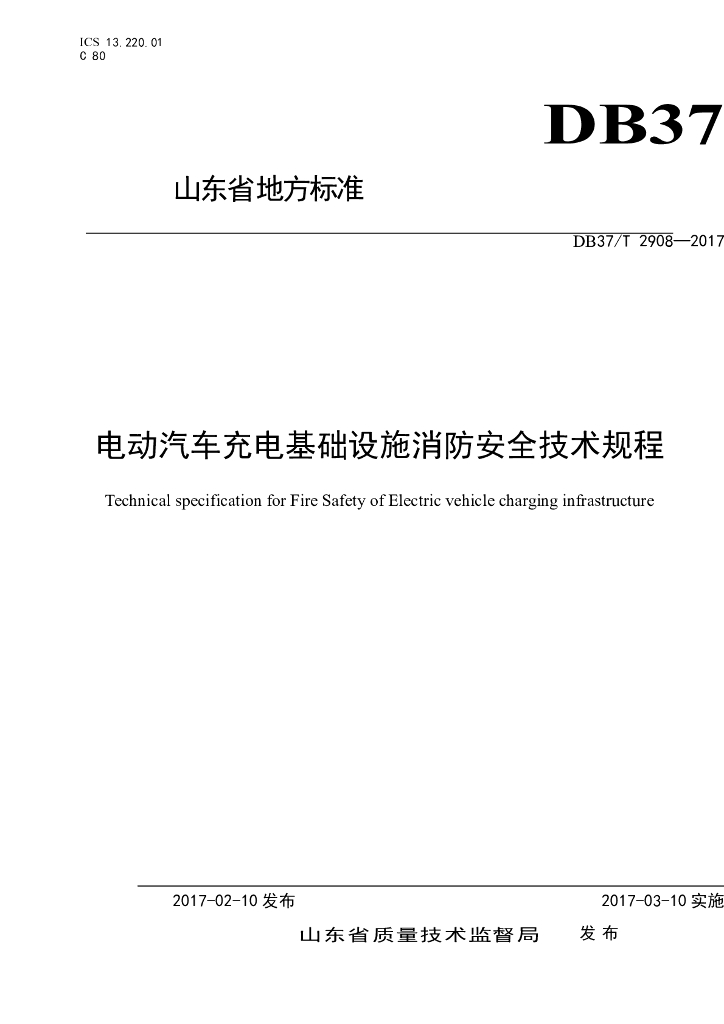 DB37/T 2908-2019 电动汽车充电基础设施消防安全技术规程