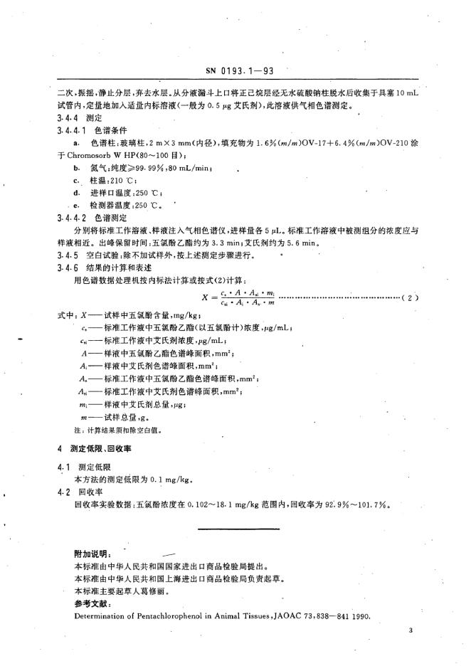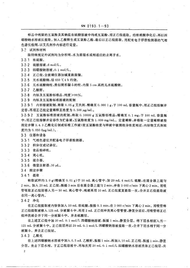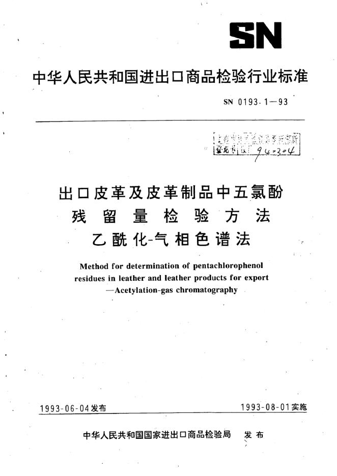 SN/T 0193.1-1993 出口皮革及皮革制品中五氯酚残留量检验方法 乙酰化-气相色谱法