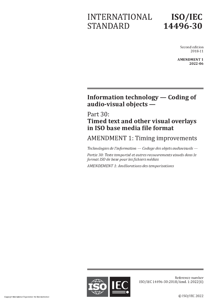 ISO/IEC 14496-30-2018/Amd 1-2022 信息技术 编码视听对象 第30部分:在ISO基础媒体文件格式定时文字等视觉覆盖 修订1
