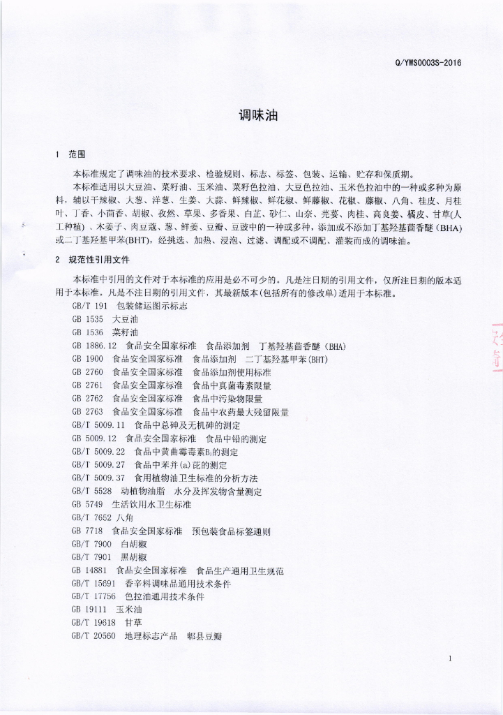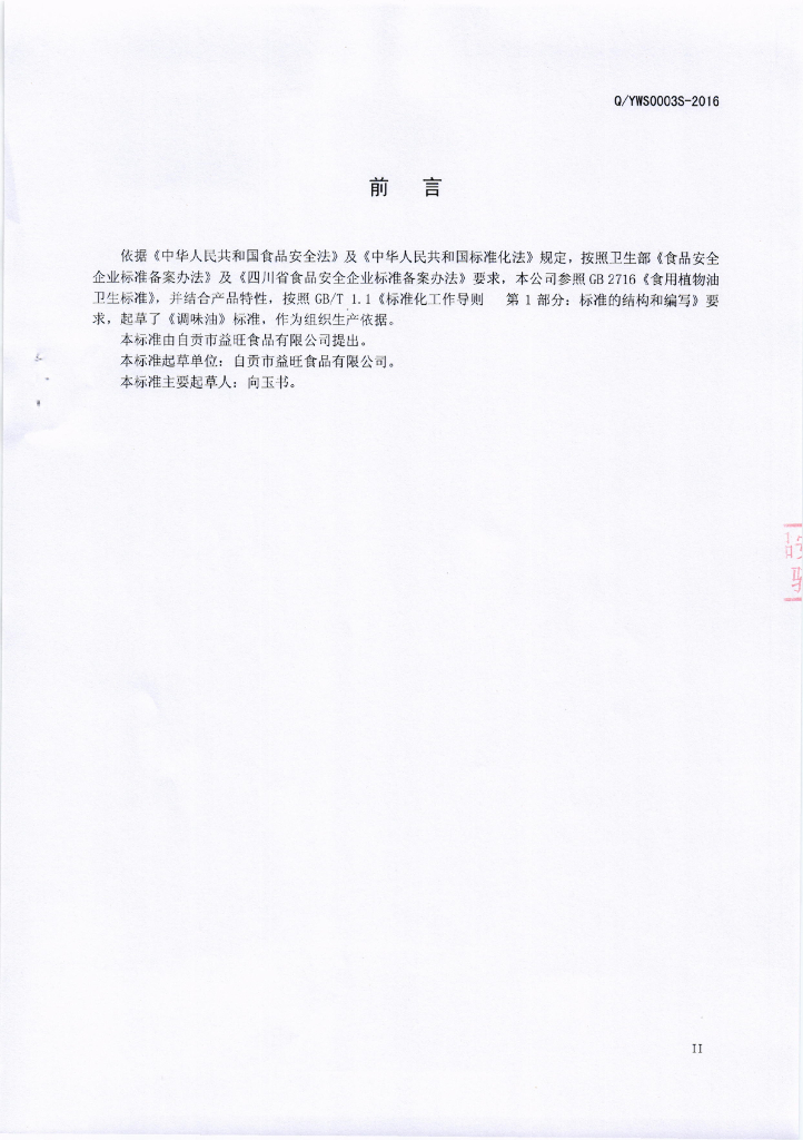 Q/YWS 0003S-2016 自贡市益旺食品有限公司 调味油
