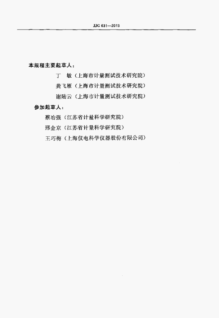丁敏(上海市计量测试技术研究院)、龚飞雁(上海市计量测试技术研究院)、谢陆云(上海市计量测试技术研究院)、蔡冶强(江苏省计量科学研究院)、邢金京(江苏省计量科学研究院)、王巧梅(上海仪电科学仪器股份有限公司)