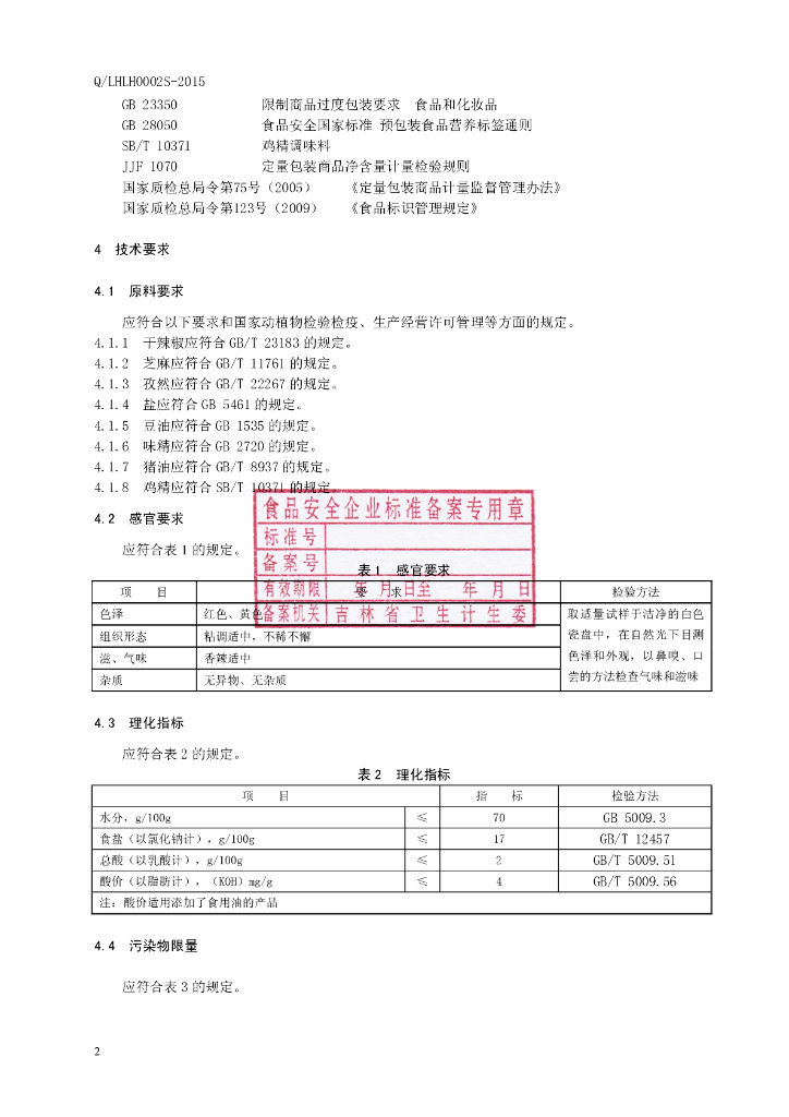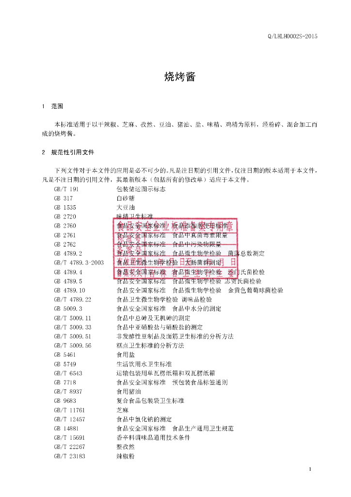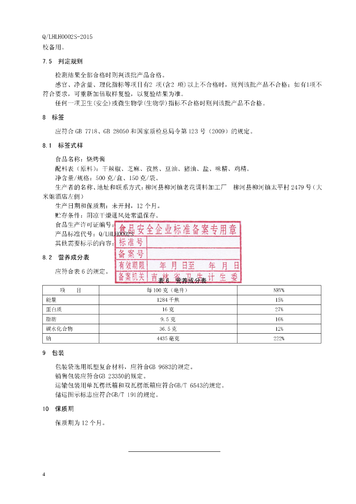 Q/LHLH 0002S-2015 柳河县柳河镇老花调料加工厂 烧烤酱