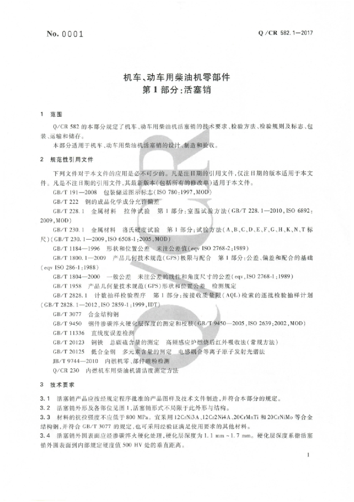 Q/CR 582.1-2017 机车、动车用柴油机零部件 第1部分:活塞销