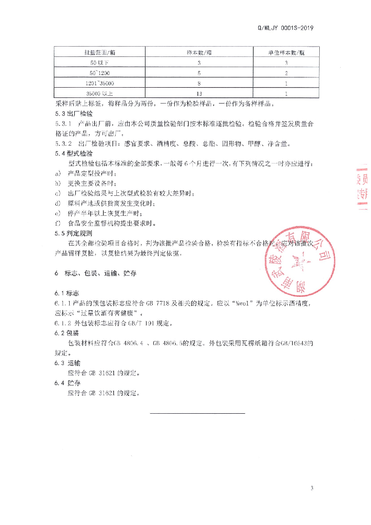 Q/WLJY 0001S-2019 武陵酒