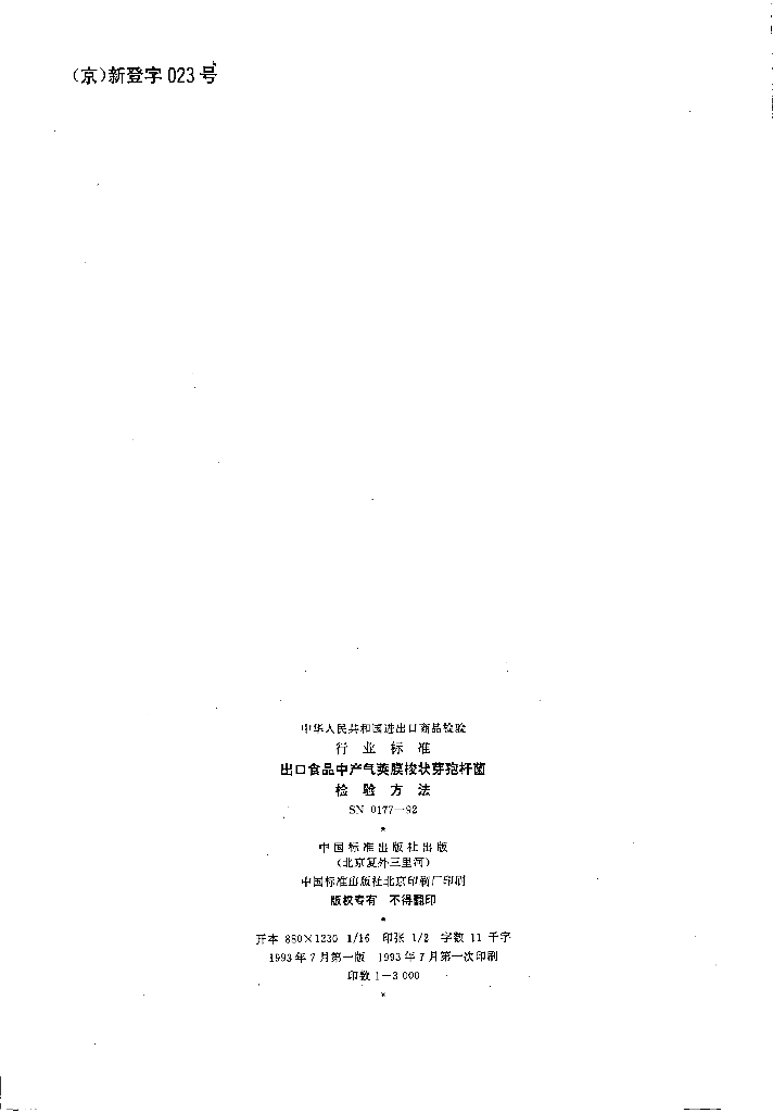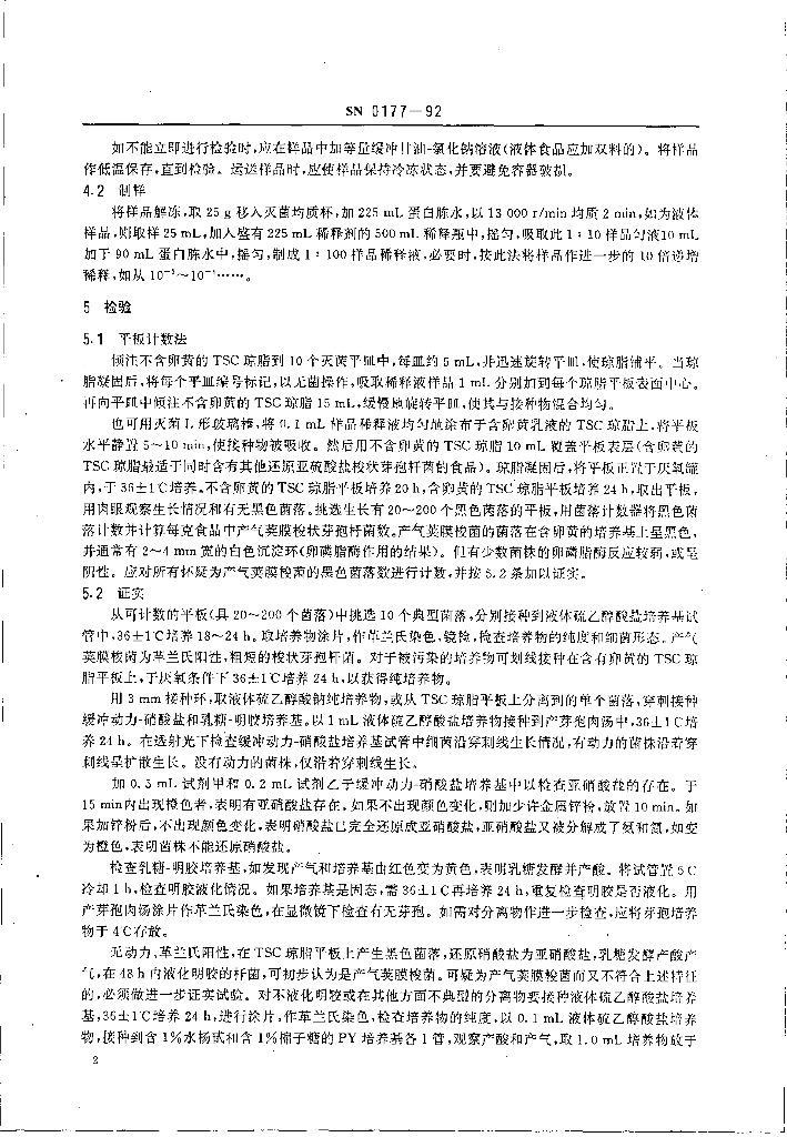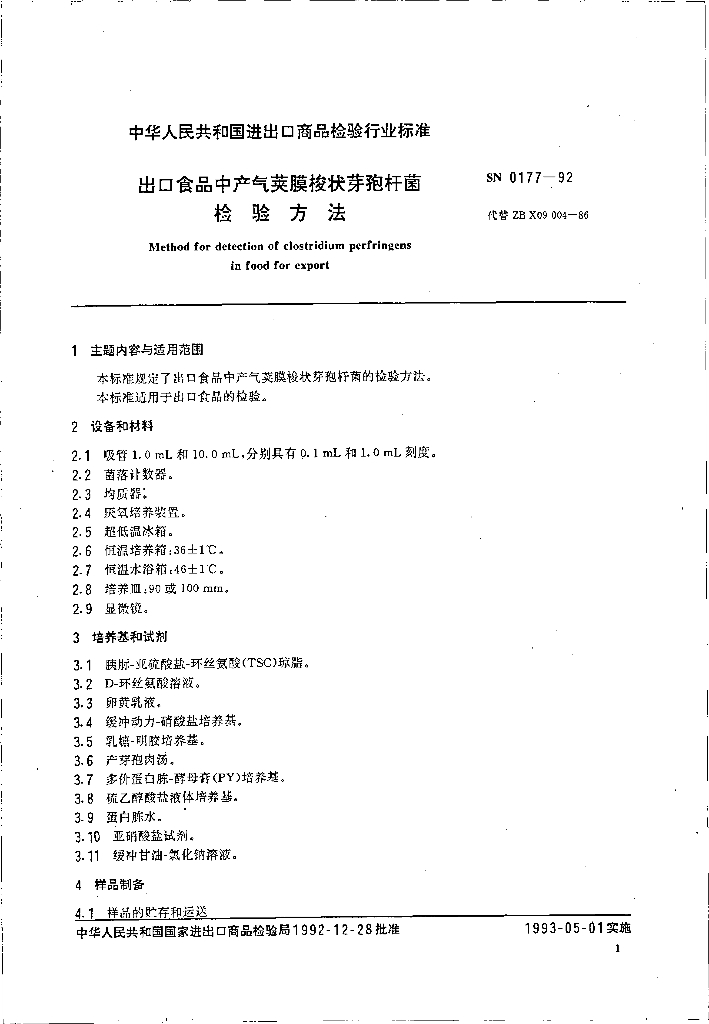 SN 0177-1992 出口食品中产气荚膜梭状芽孢杆菌检验方法