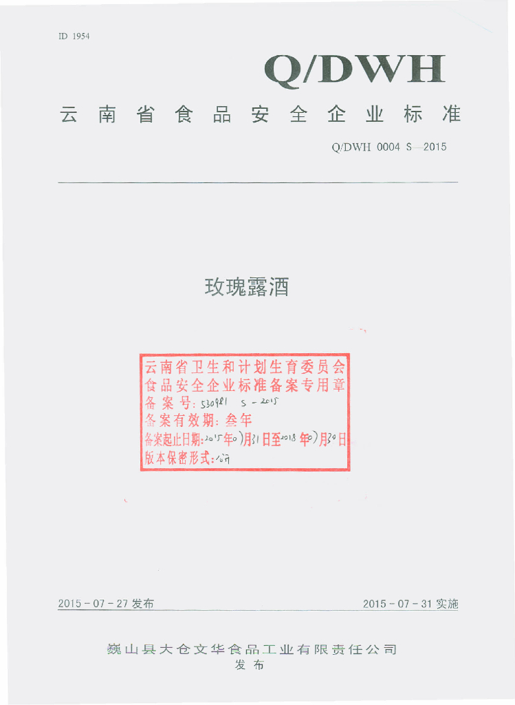 Q/DWH 0004S-2015 巍山县大仓文华食品工业有限责任公司 玫瑰露酒