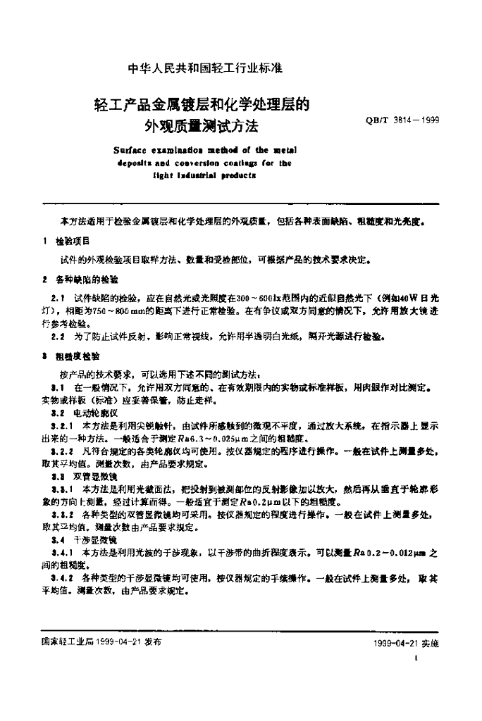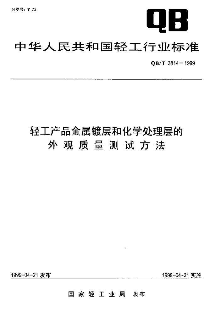 QB/T 3814-1999 轻工产品金属镀层相化学处理层的外观质量测试方法