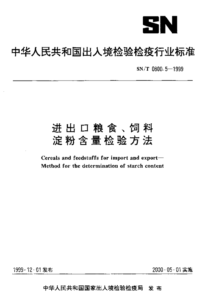 SN/T 0800.5-1999 进出口粮食、饲料淀粉含量检验方法