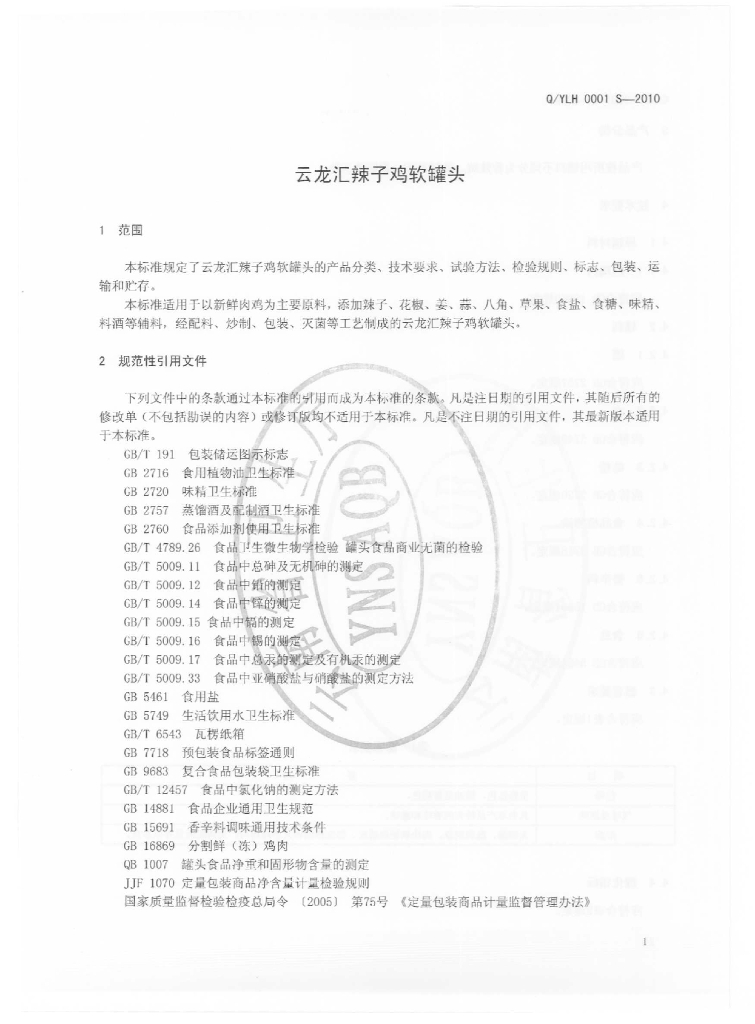 Q/YLH 0001S-2010 云龙汇辣子鸡软罐头