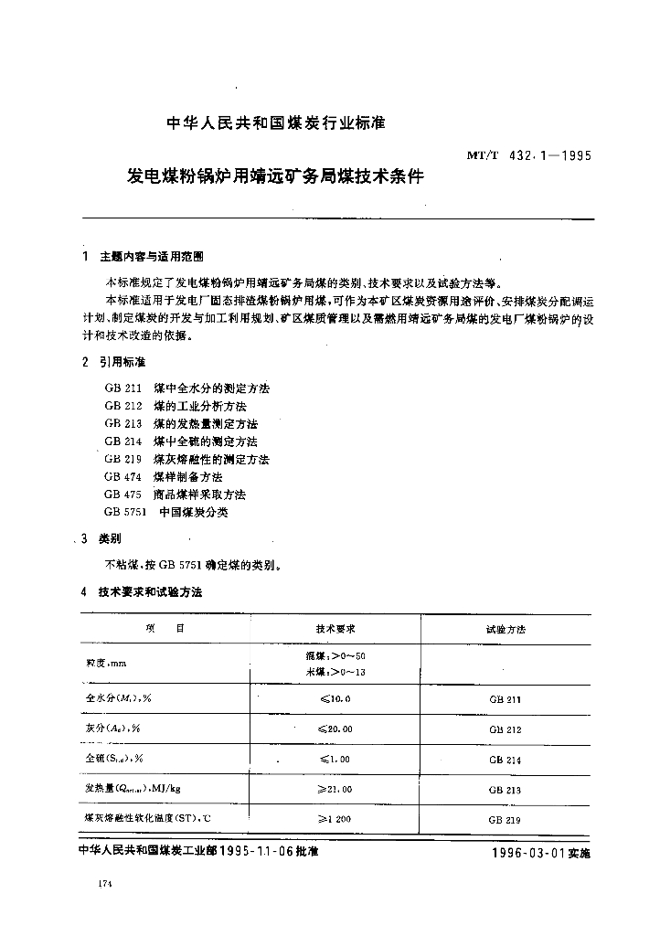 MT/T 432.1-1995 发电煤粉锅炉用靖远矿务局煤技术条件
