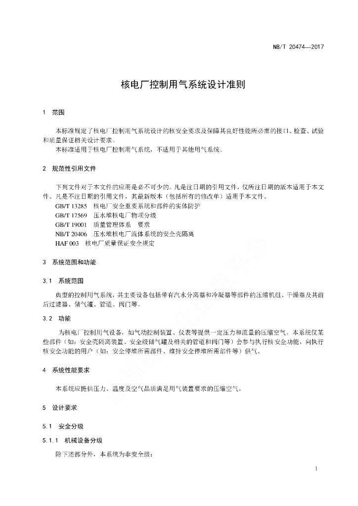 NB/T 20474-2017 核电厂控制用气系统设计准则