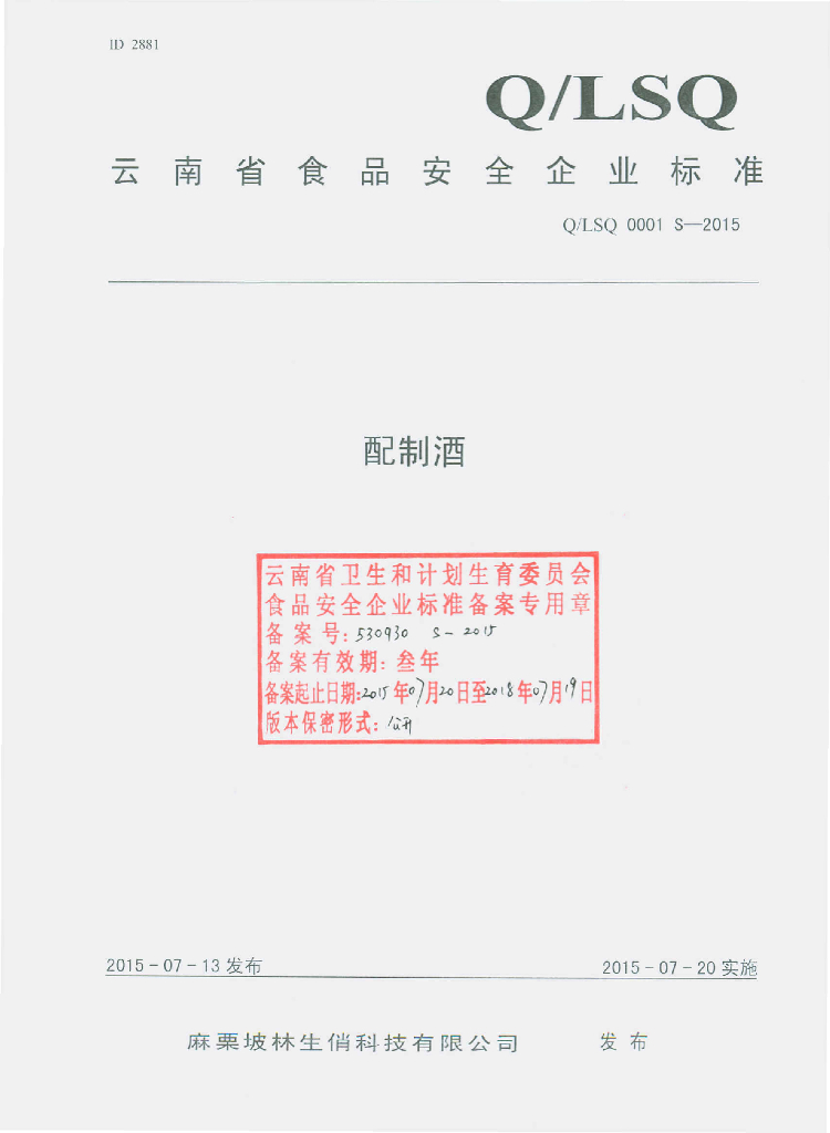 Q/LSQ 0001S-2015 麻栗坡林生俏科技有限公司 配制酒