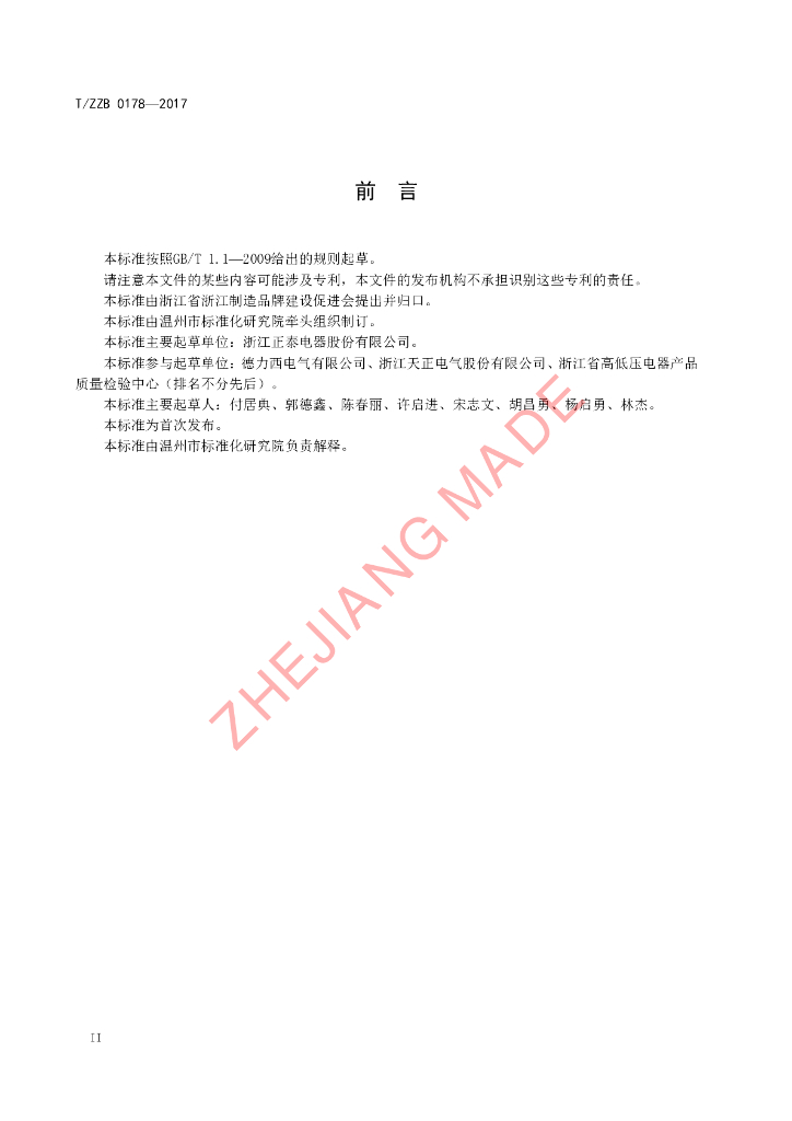 本标准由温州市标准化研究院牵头组织制订。、本标准主要起草单位:浙江正泰电器股份有限公司。、本标准参与起草单位:德力西电气有限公司、浙江天正电气股份有限公司、浙江省高低压电器产品质量检验中心(排名不分先后)。