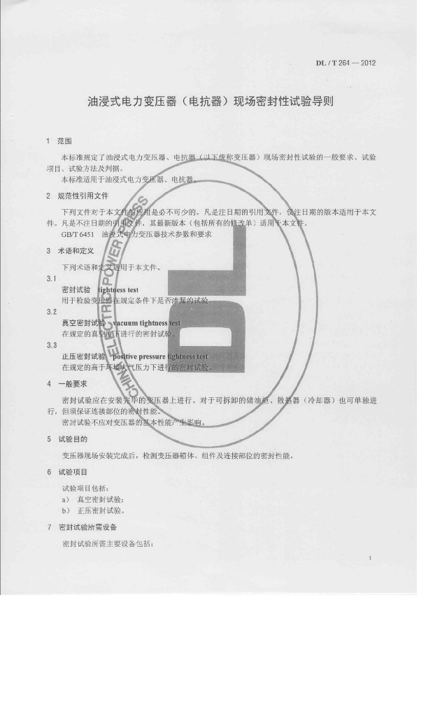 DL/T 264-2012 油浸式电力变压器(电抗器)现场密封性试验导则