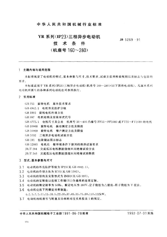 JB 5269-1991 YR系列IP23三相异步电动机技术条件机座号码160~280