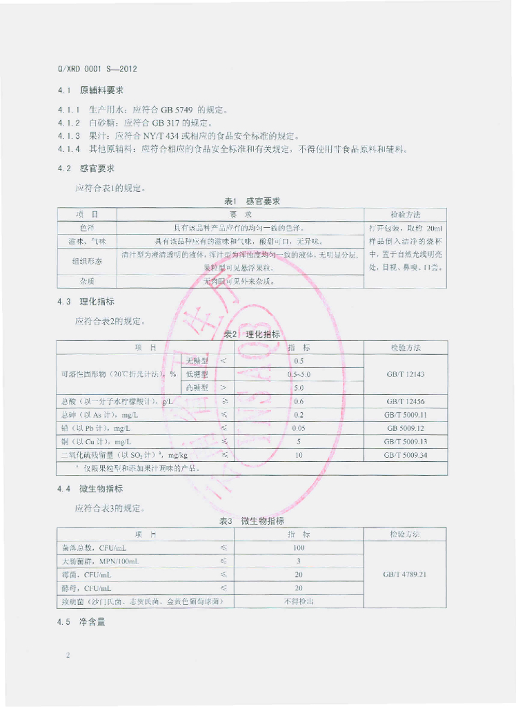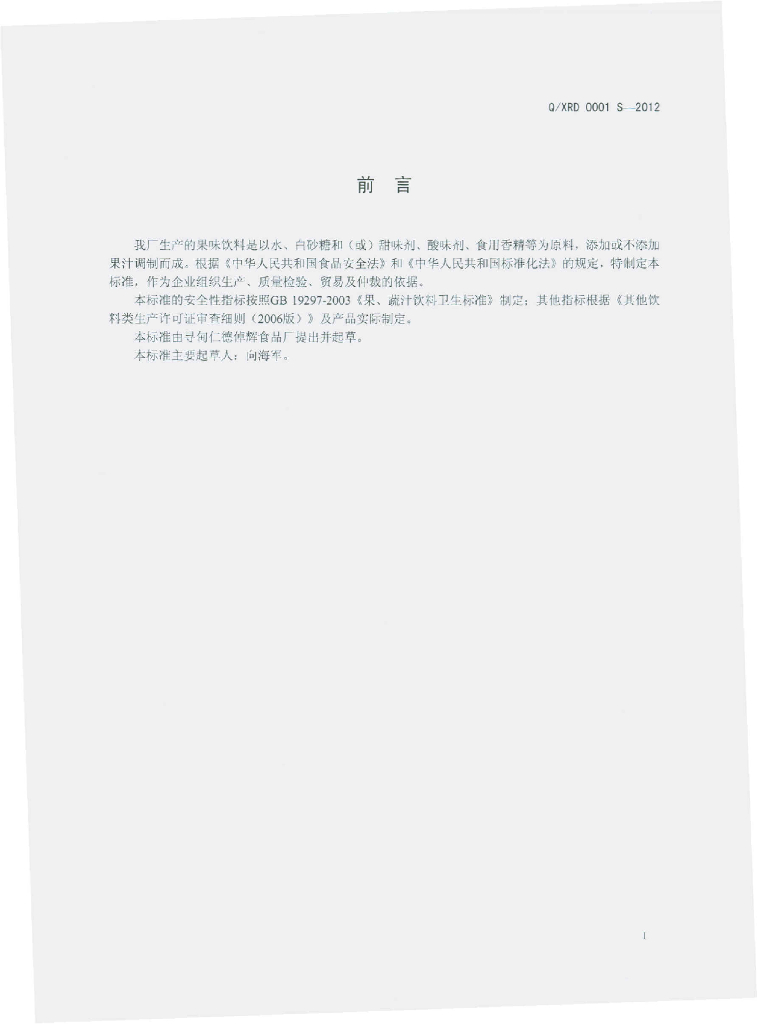 Q/XRD 0001S-2012 果味饮料