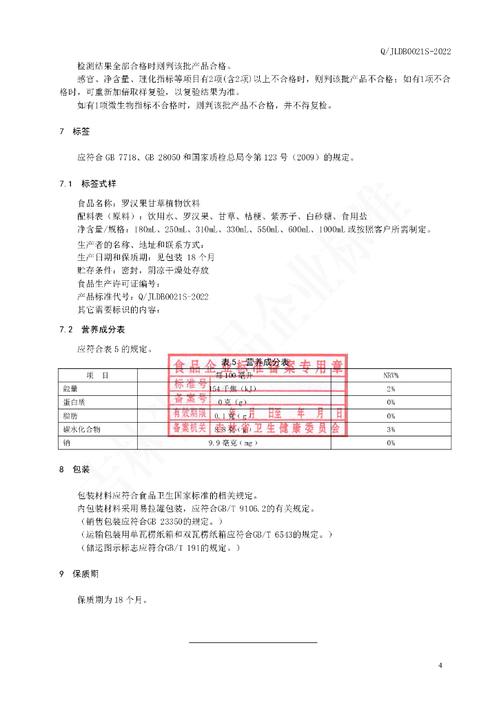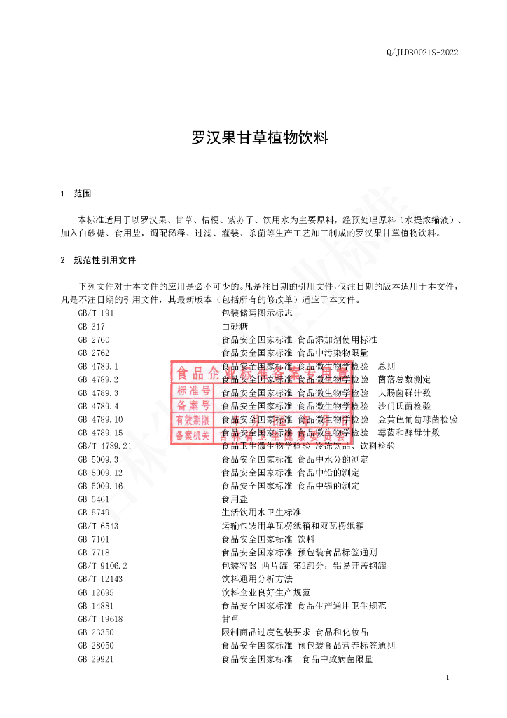 Q/JLDB 0021S-2022 罗汉果甘草植物饮料