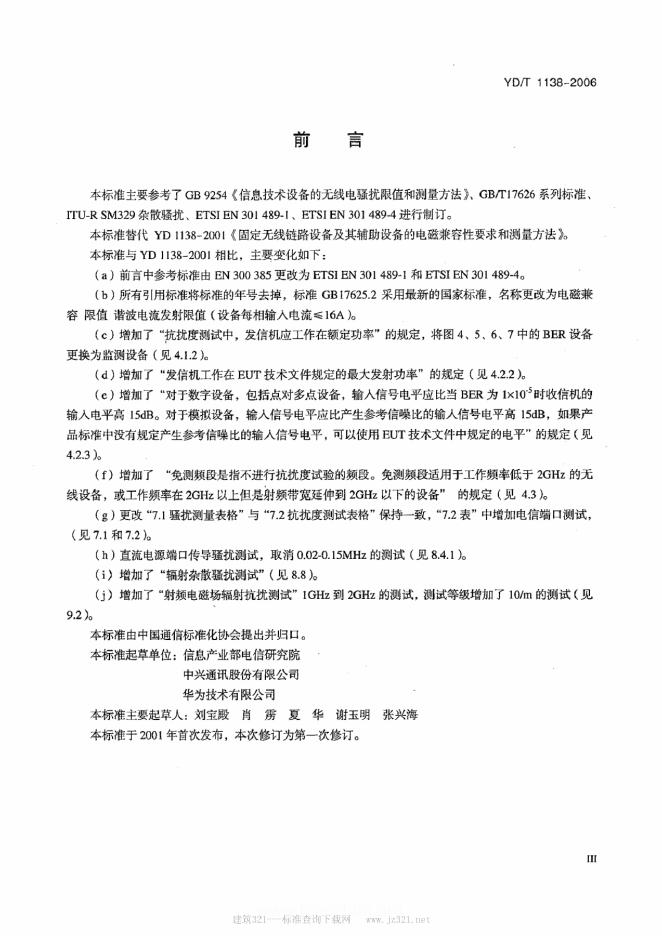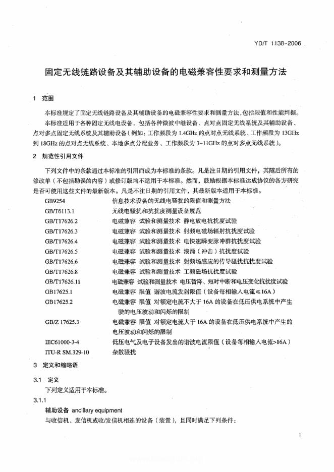 YD/T 1138-2006 固定无线链路设备及其辅助设备的电磁兼容性要求和测量方法