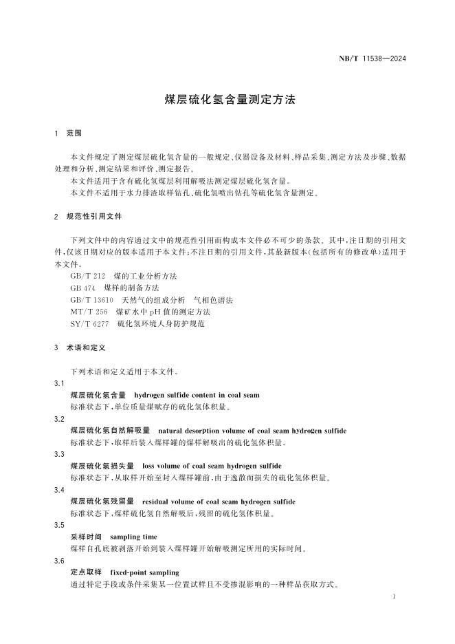 NB/T 11538-2024 煤层硫化氢含量测定方法