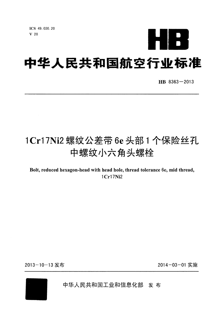 HB 8363-2013 1Cr17Ni2螺纹公差带6e头部1个保险丝孔中螺纹小六角头螺栓