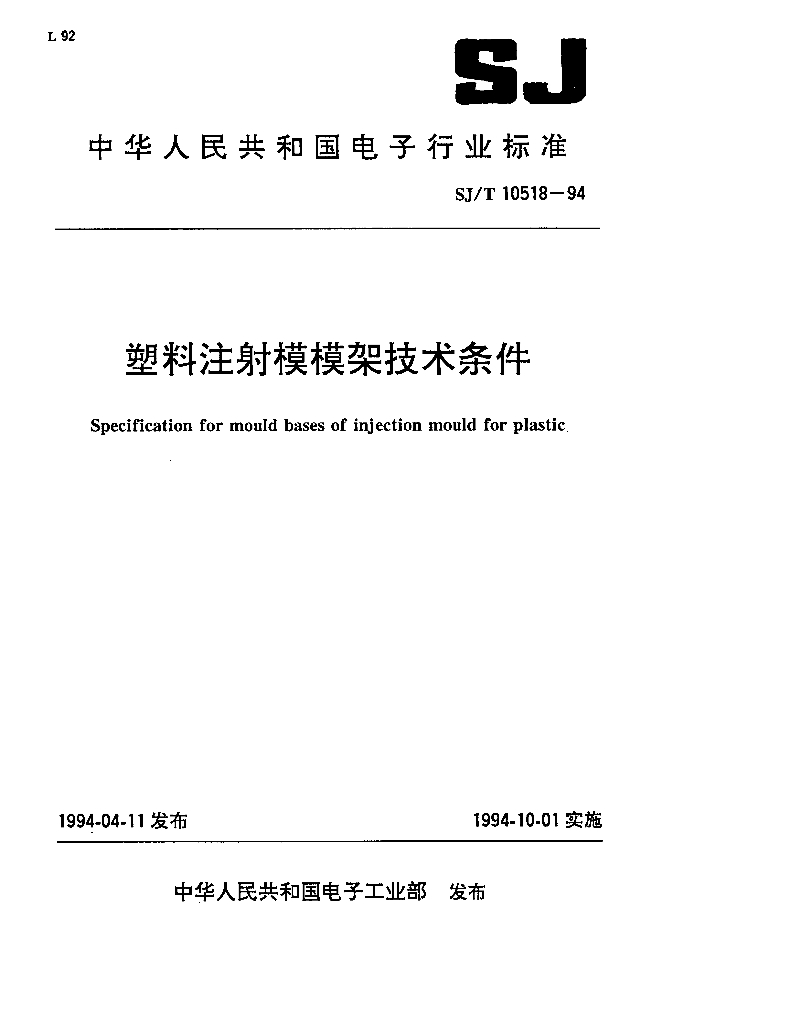 SJ/T 10518-1994 塑料注射模模架技术条件