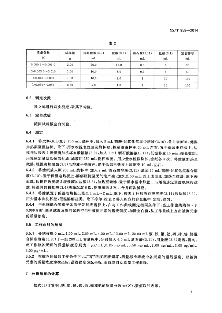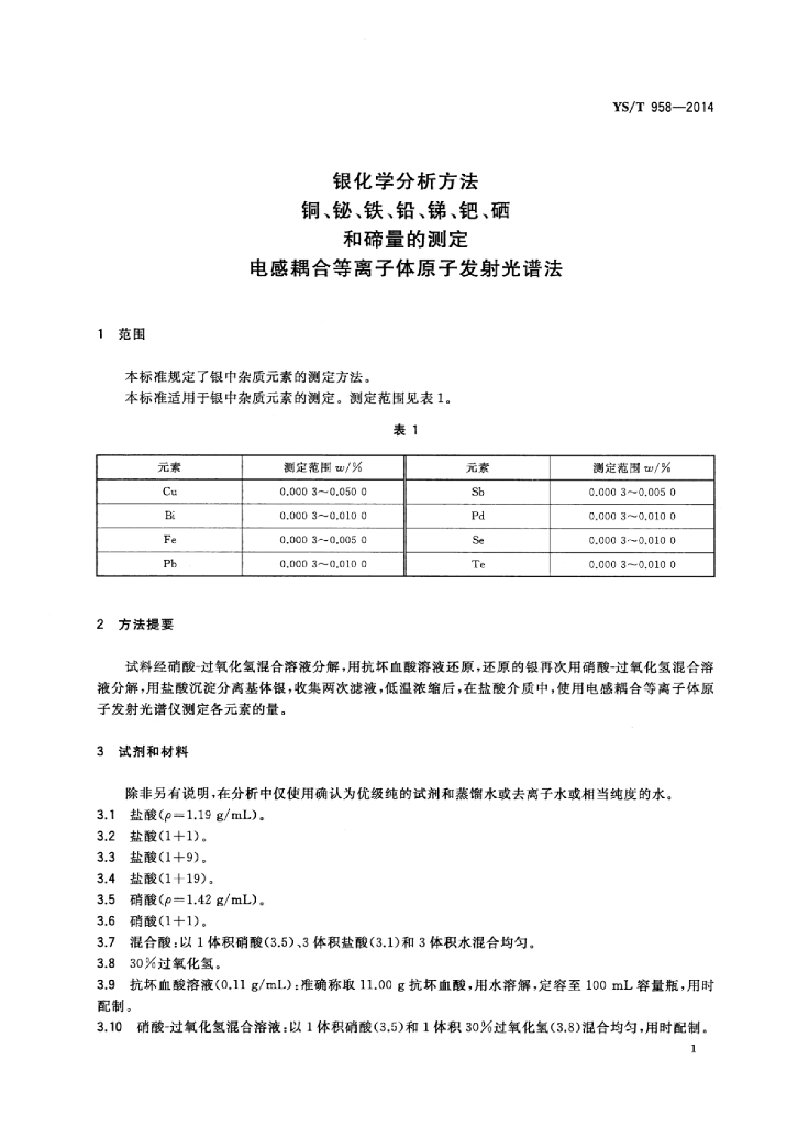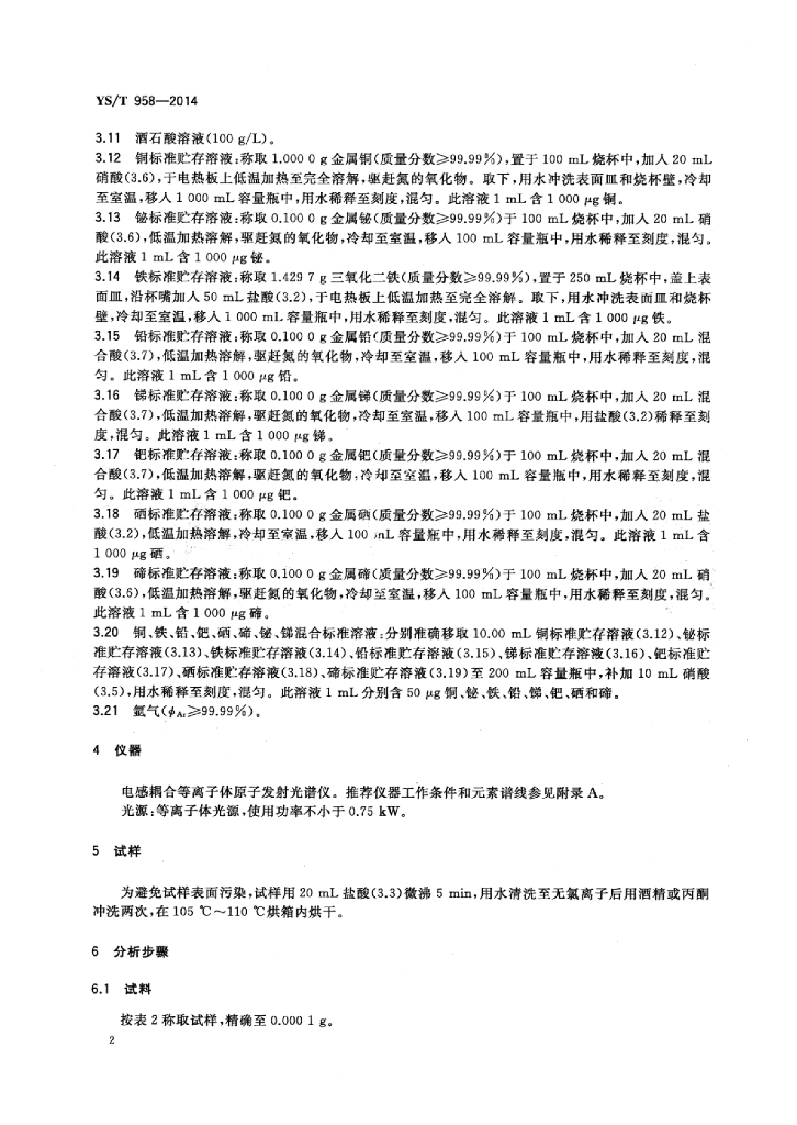 YS/T 958-2014 银化学分析方法铜、铋、铁、铅、锑、钯、硒和碲量的测定电感耦合等离子体原子发射光谱法