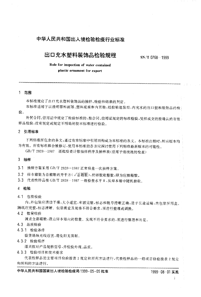 SN/T 0768-1999 出口充水塑料装饰品检验规程