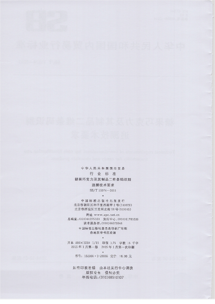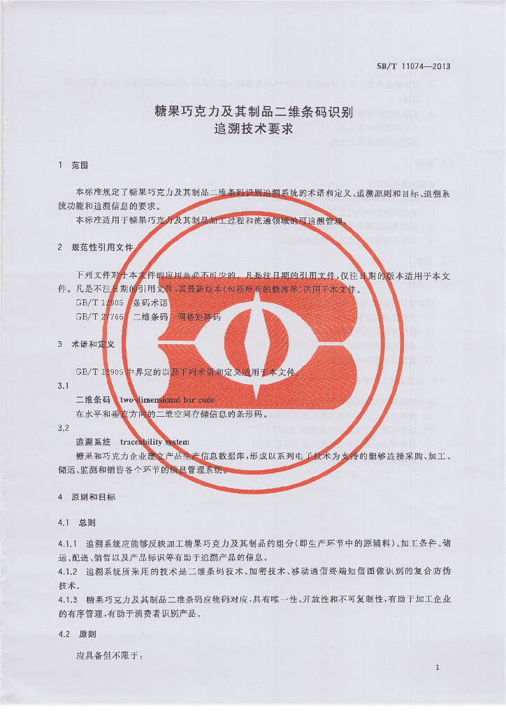 SB/T 11074-2013 糖果巧克力及其制品二维条码识别追溯技术要求