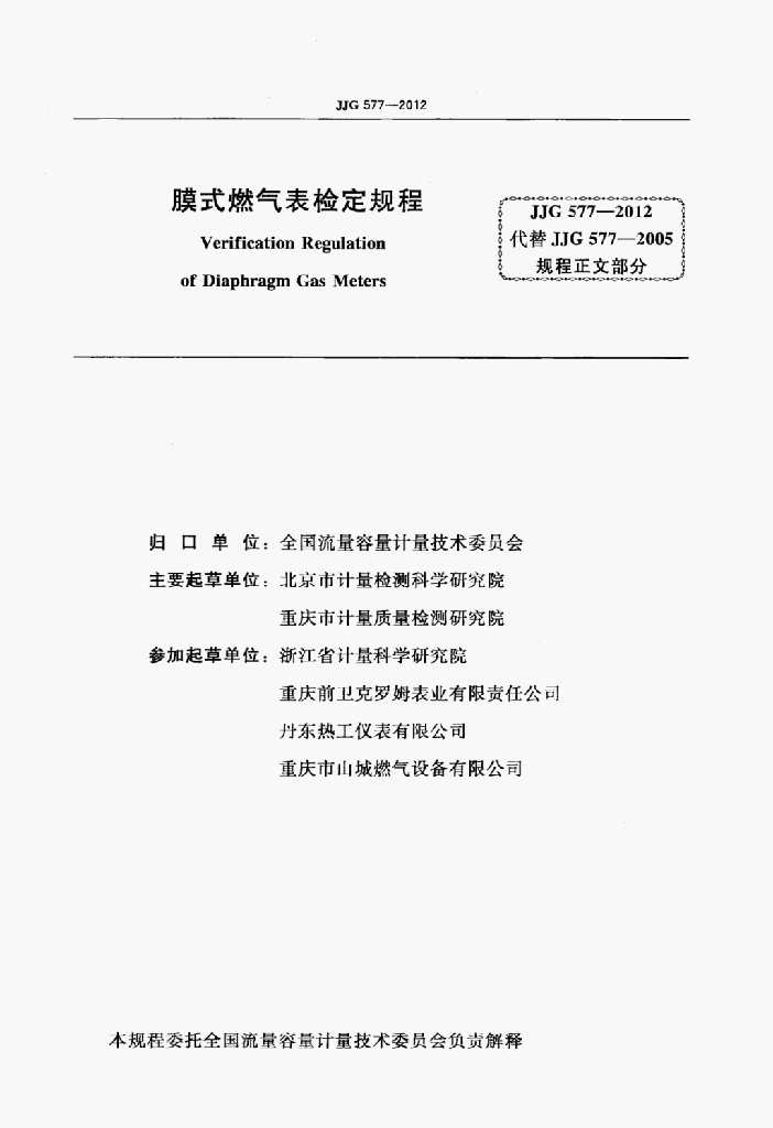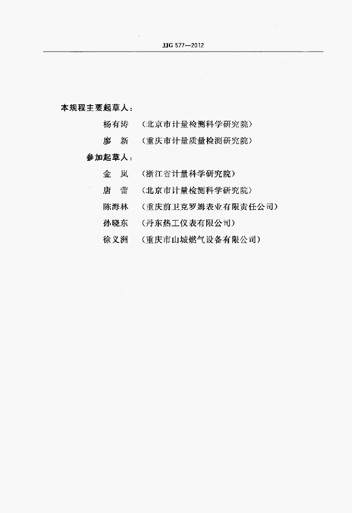 杨有涛(北京市计量检测科学研究院)、廖新(重庆市计量质量检测研究院)、金岚(浙江省计量科学研究院)、唐蕾(北京市计量检测科学研究院)、陈海林(重庆前卫克罗姆表业有限责任公司)、孙晓东(丹东热工仪表有限公司)、徐义洲(重庆市山城燃气设备有限公司)