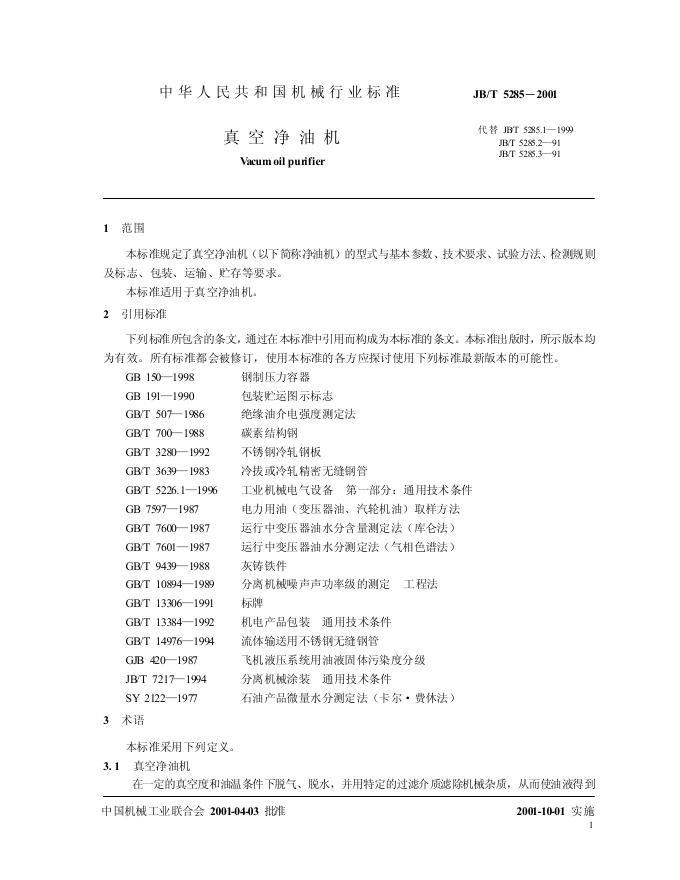 JB/T 5285.2-1991 真空净油机 技术条件