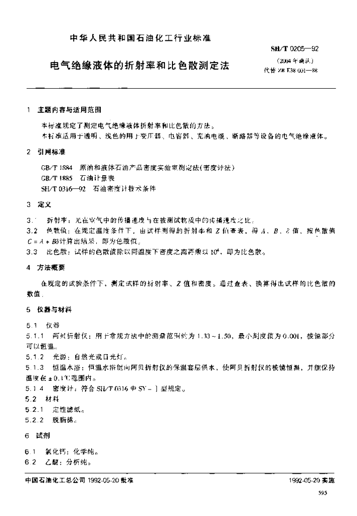 SH/T 0205-1992 电气绝缘液体的折射率和比色散测定法