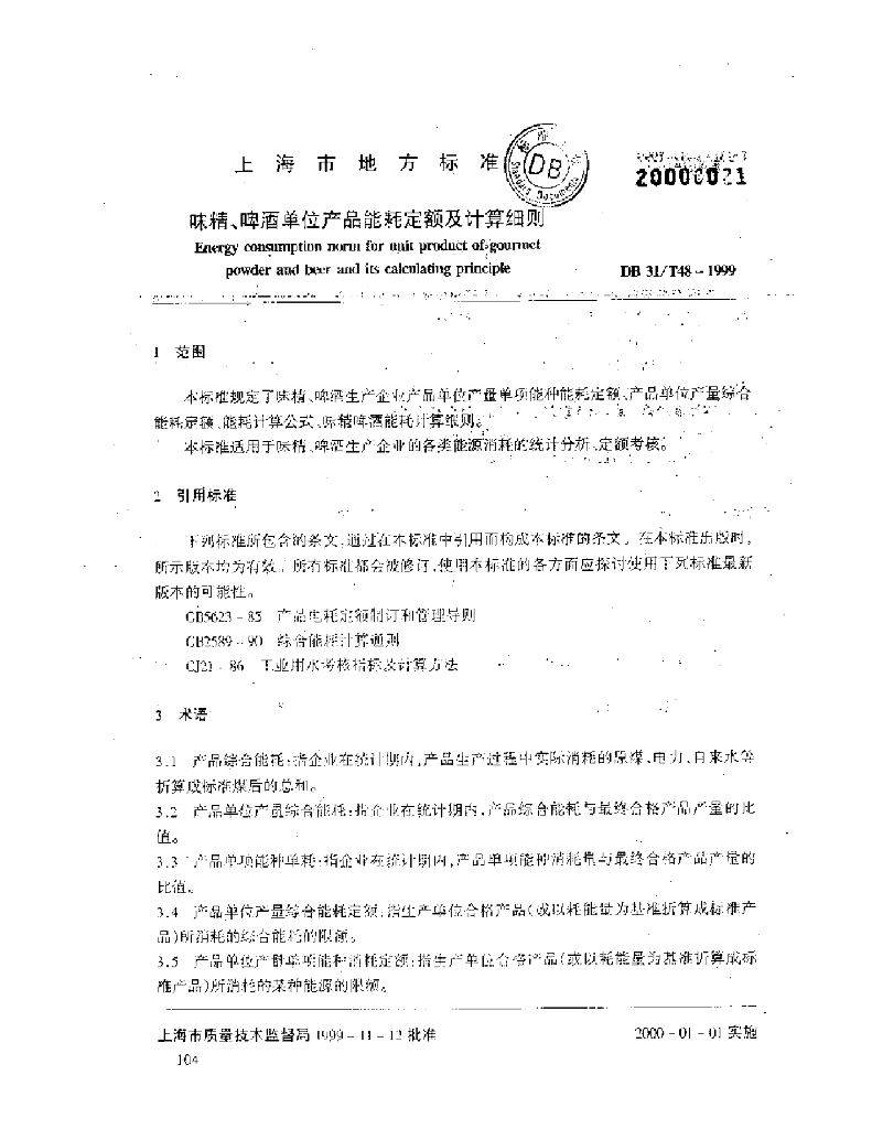DB31/T 48-1999 味精、啤酒单位产品能耗定额及计算细则