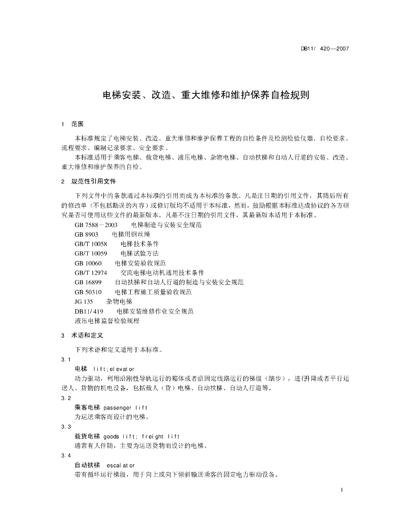 DB11/ 420-2007 电梯安装、改造、重大维修和维护保养自检规则