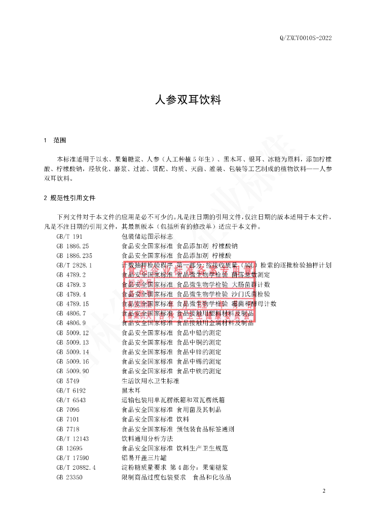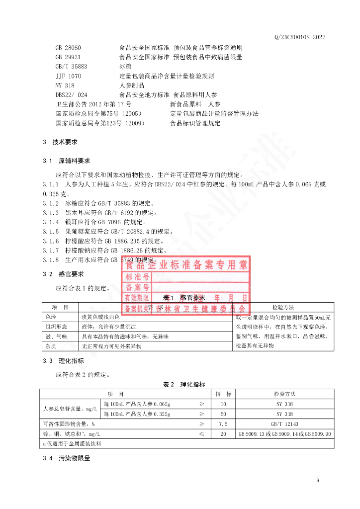 Q/ZXCY 0010S-2022 人参双耳饮料
