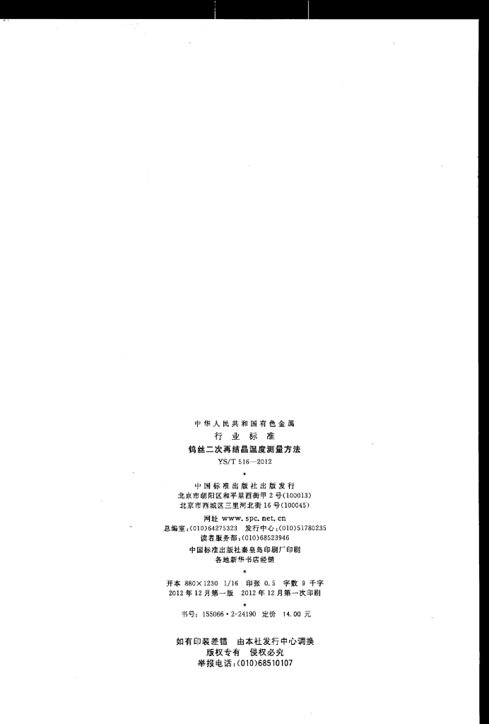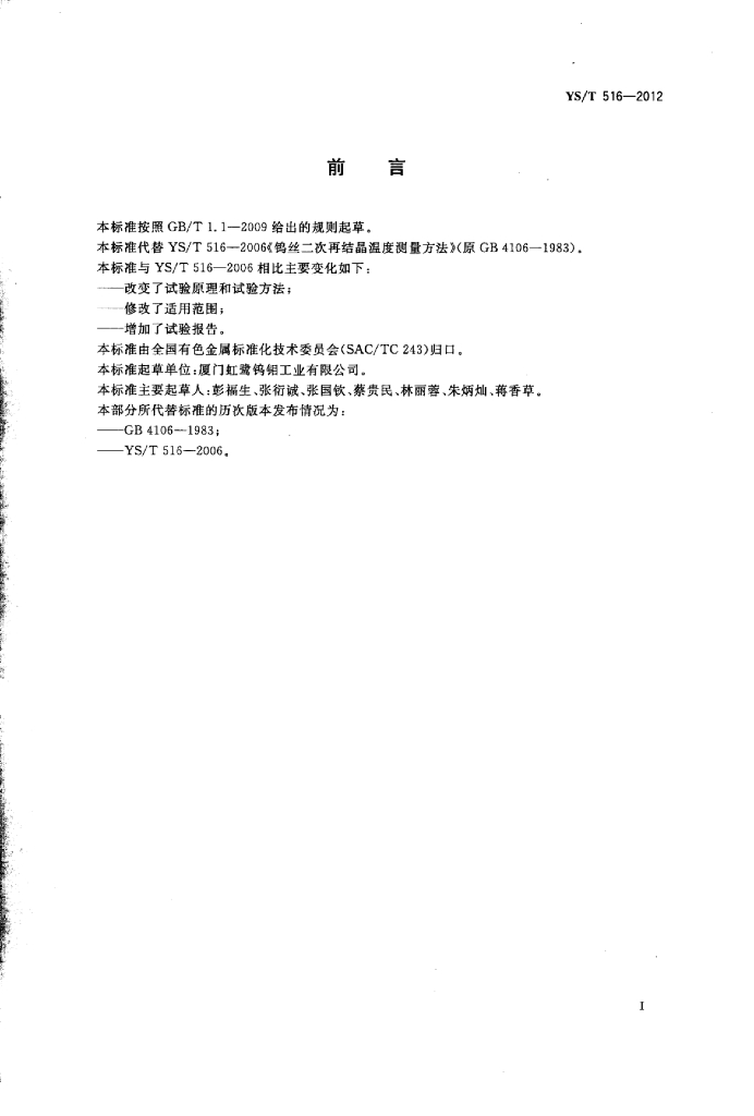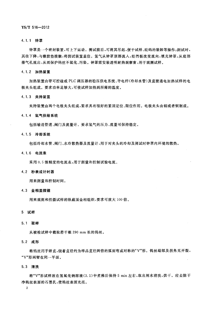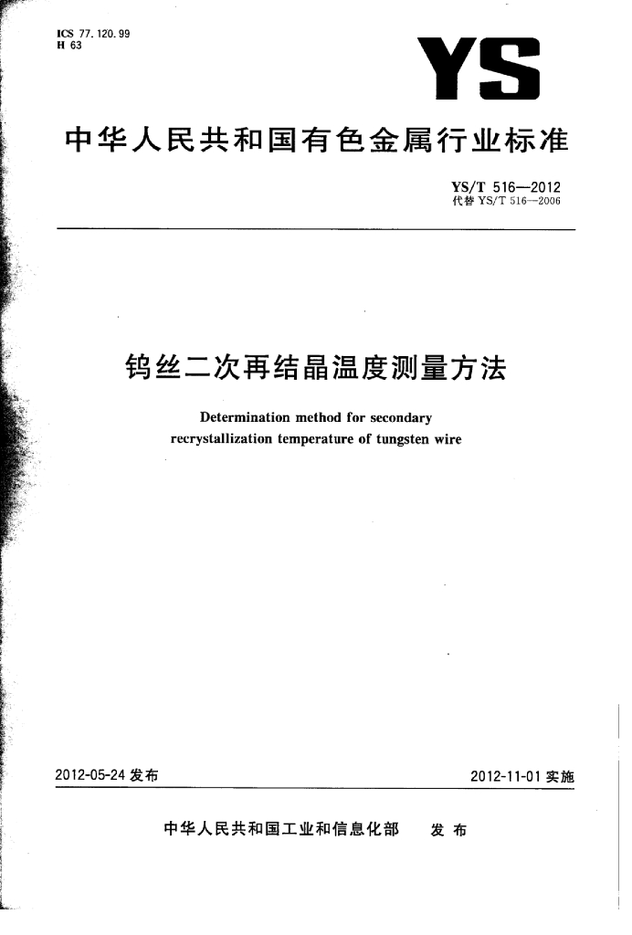 YS/T 516-2012 钨丝二次再结晶温度测量方法